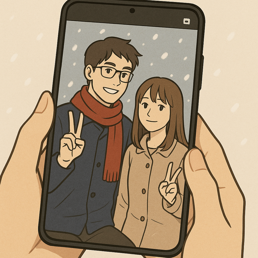 사진을 보내달라고 하자, 눈바람 속에서 다른 누군가와 함께 찍은 사진을 보내주었다.