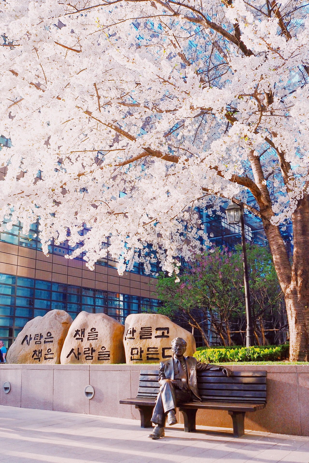 처음 며칠간 소극적으로 망울을 터뜨리던 벚나무는 기온이 오르자 순식간에 만개했다. 볕이 잘 드는 자리에 있어 그런 듯했다. 꽃이 풍성해지니 이번엔 염상섭 선생의 동상과 신용호 회장의 명언이 다시 눈에 들어왔다. 소설가와 책과 꽃이 한데 어우러진 모습이 퍽 근사하다고 생각했다.