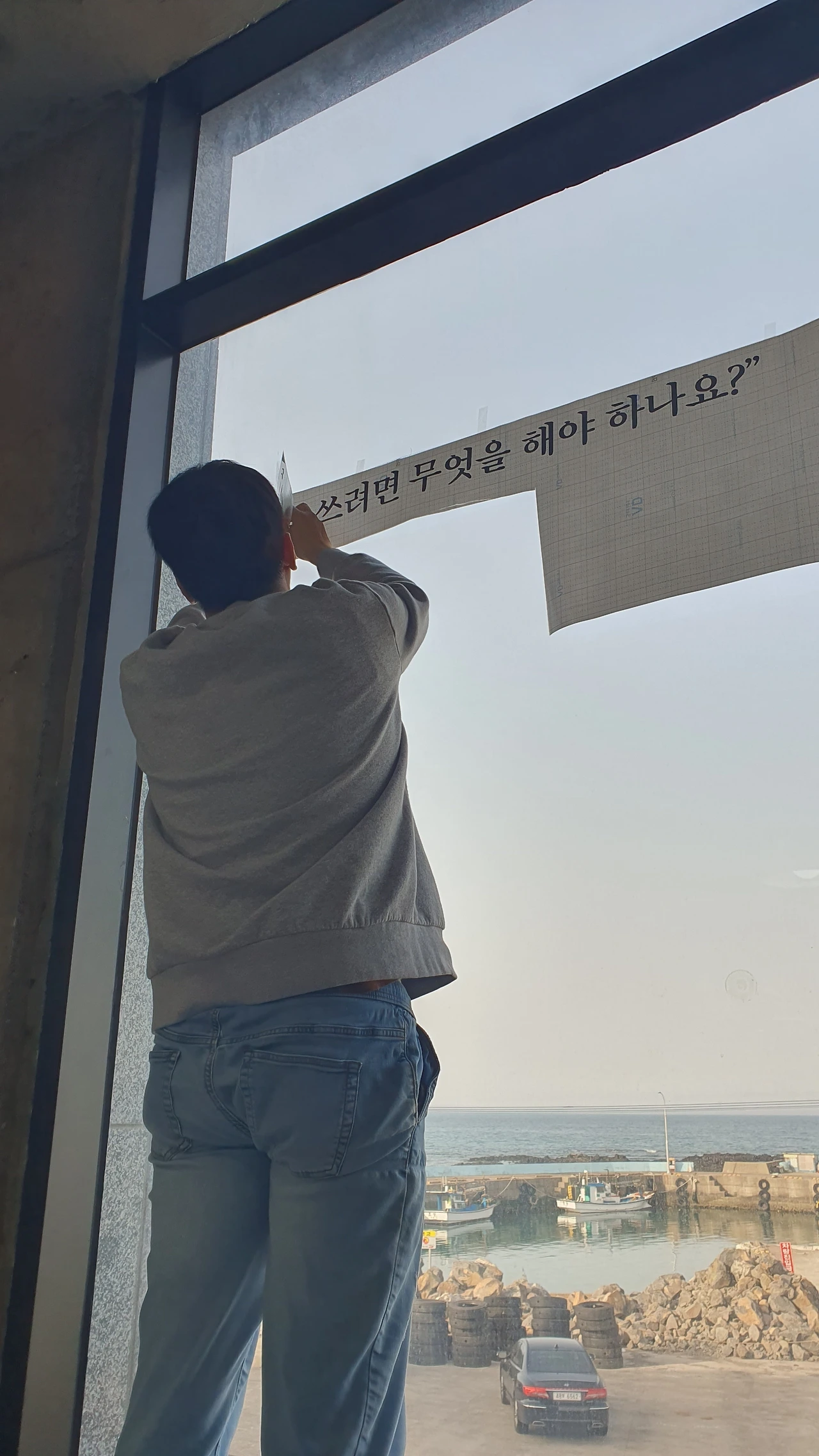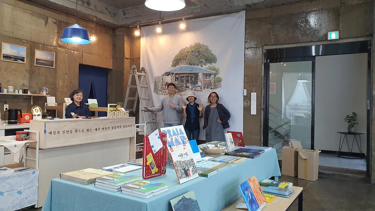 아름다운 평대바다가 보이는 뷰가 끝내주는 곳에 위치해있다. 둘째 아들과 단 둘이 제주시 여행하기로 하고, 서귀포에서 평대리까지 머나먼 여정을 왔다. 거의 5~6년만에 남해의봄날 봄님을 만나고, 일년서가 창문에 멋진 문장 스티커를 붙였다. 사다리를 타고 올라가 천장 벽에 현수막도 걸었다.
