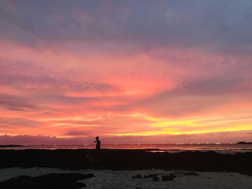 그리고 그날 우리는 친구 가족과 함께 저녁 무렵 금릉 바닷가에 놀러 가서 아름다운 석양과 바다, 비양도를 바라보면서 치킨을 먹었다.