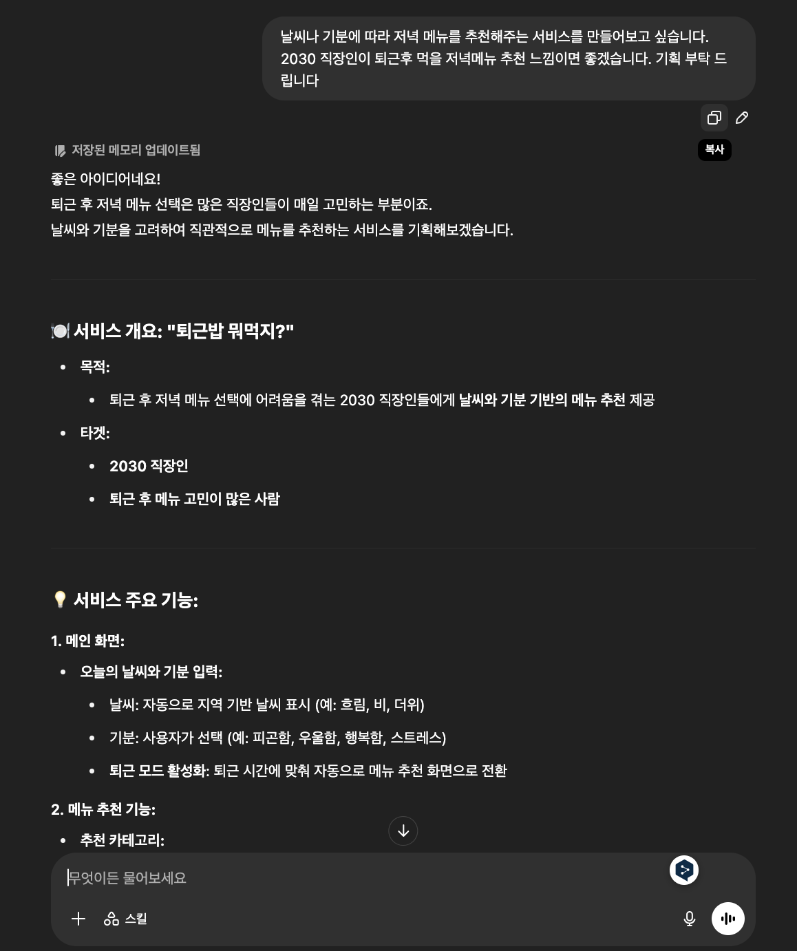 아이디어를 ChatGPT에 입력하고 서비스 기획을 해달라고 했어요. ChatGPT는 곧장 서비스 네이밍 (“퇴근밥 뭐 먹지?”)부터 각 화면별 주요 기능, 부가적으로 있으면 좋을 기능, 수익 모델과 개발 고려 사항까지 쭉 정리해 줬습니다. 특히 메뉴 추천 시 사용자 근처 식당을 탐색하는 기능을 추가할 것을 제안해 줬는데, 이 기능이 포함되면 정말 좋겠다고 생각했으나... 서비스를 최대한 단순하게 만들고 싶어 포기하고 나머지 기능 중심으로 GPT와 기획안을 발전시켰어요.
