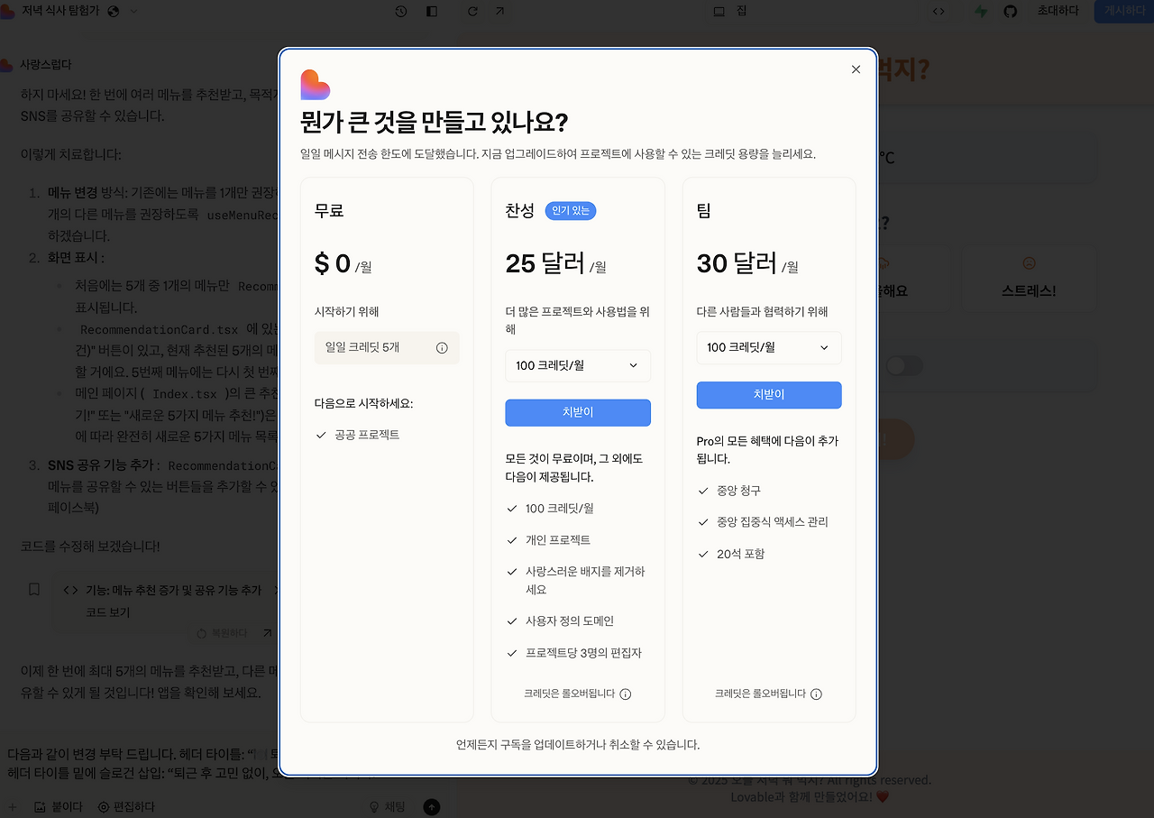 물론 당연히 디테일은 수정 보완이 필요했어요. 간단한 기능 수정, 헤더 문구 수정, 디자인 색상 수정 등을 Lovable 채팅창을 통해 한국어로 요청했는데 대부분 잘 반영되더라고요. 다만 정확도를 높이기 위해서는 기분에 따라 어떤 음식을 추천할 것인지 기초 데이터를 ChatGPT와 함께 만들어 입력하는 게 좋다는 생각이 들었습니다. 또한, 미세 조정을 위해서는 이쯤에서 Lovable 가이드 문서를 확인하는 것이 필요해 보였어요. 더 진행하려고 했지만, 갑자기 추가 이용은 결제가 필요하다는 화면이 떴습니다. 무료 버전은 하루 5개 크레디트 사용으로 제한되어 있거든요.