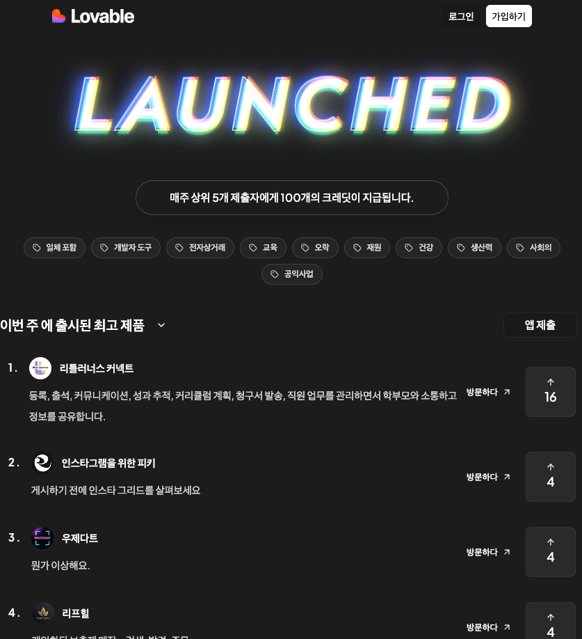 * Lovable Launched를 통해 Lovable로 만든 인기 프로젝트를 확인할 수 있다. 프로젝트 아이디어를 얻는 데에도 도움이 된다.