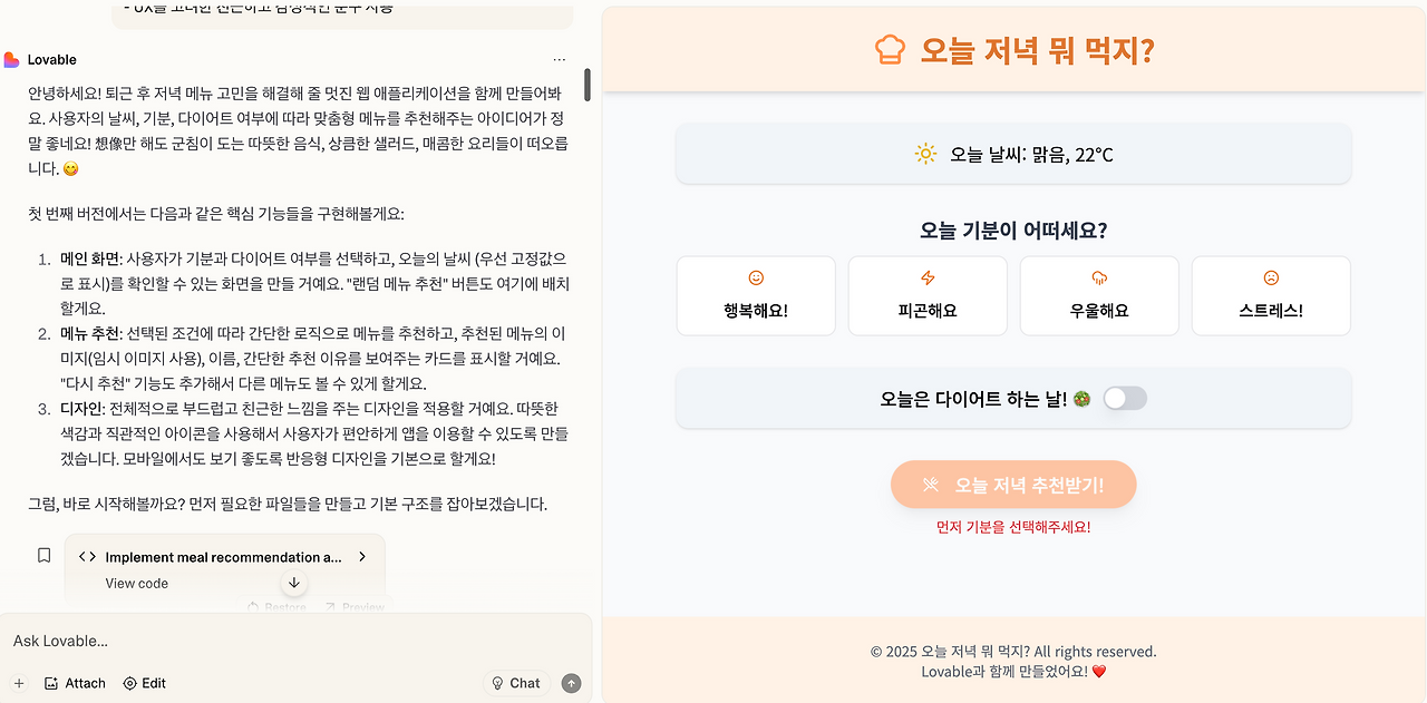 결과적으로는 Lovable로 빠르게 MVP의 초기 버전 정도는 확인할 수 있어 만족했습니다만, Lovable 무료 버전으로 비개발자인 제가 혼자 어디까지 구축 가능할지 궁금해졌습니다. 그래서 <퇴근밥 뭐 먹지>를 좀 더 완성도 있게 수정 보완해 배포까지 진행해보려 해요.