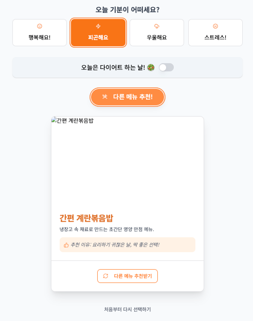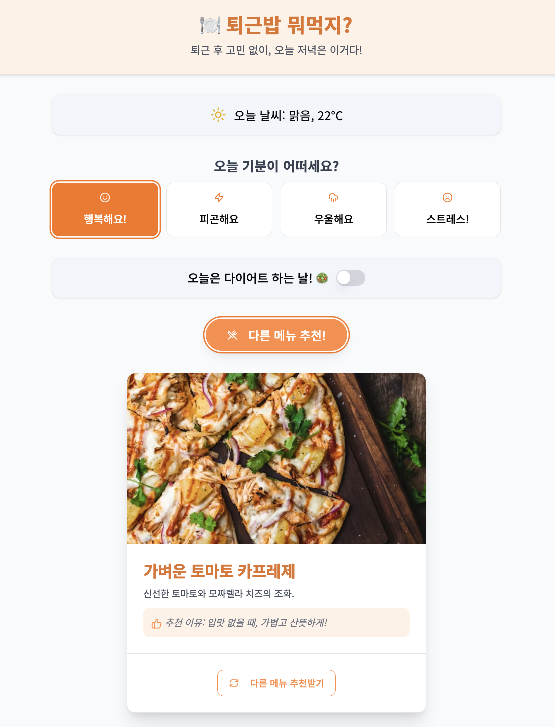 AI가 도와주겠지만, 개발 난이도를 최대한 낮추기 위해 단순하고 직관적인 프로젝트를 만들고 싶었습니다. 그래서 생각한 아이디어가 퇴근밥 추천 도구였어요! 직장인인 저는 늘 퇴근길에 저녁 메뉴를 고민하는데요, 맛있는 저녁을 먹으면 하루 동안 쌓인 스트레스가 해소되는 기분이 들거든요. 그래서 그냥 저녁 메뉴 추천이 아닌, 퇴근길에 내 기분과 날씨, 그리고 다이어트 여부를 고려해 퇴근밥을 추천해 주는 도구를 만들어 보기로 했어요.