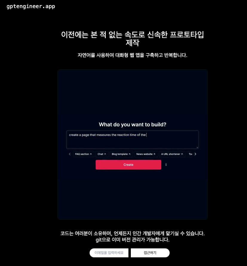 GPT Engineer 앱 버전 메인 화면 [출처 : gptengineer.app]