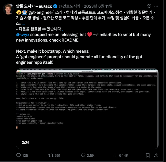 오픈 소스 프로젝트 시절, GPT Engineer를 소개하는 트윗 [출처 : 안톤 오시카 트위터 ])