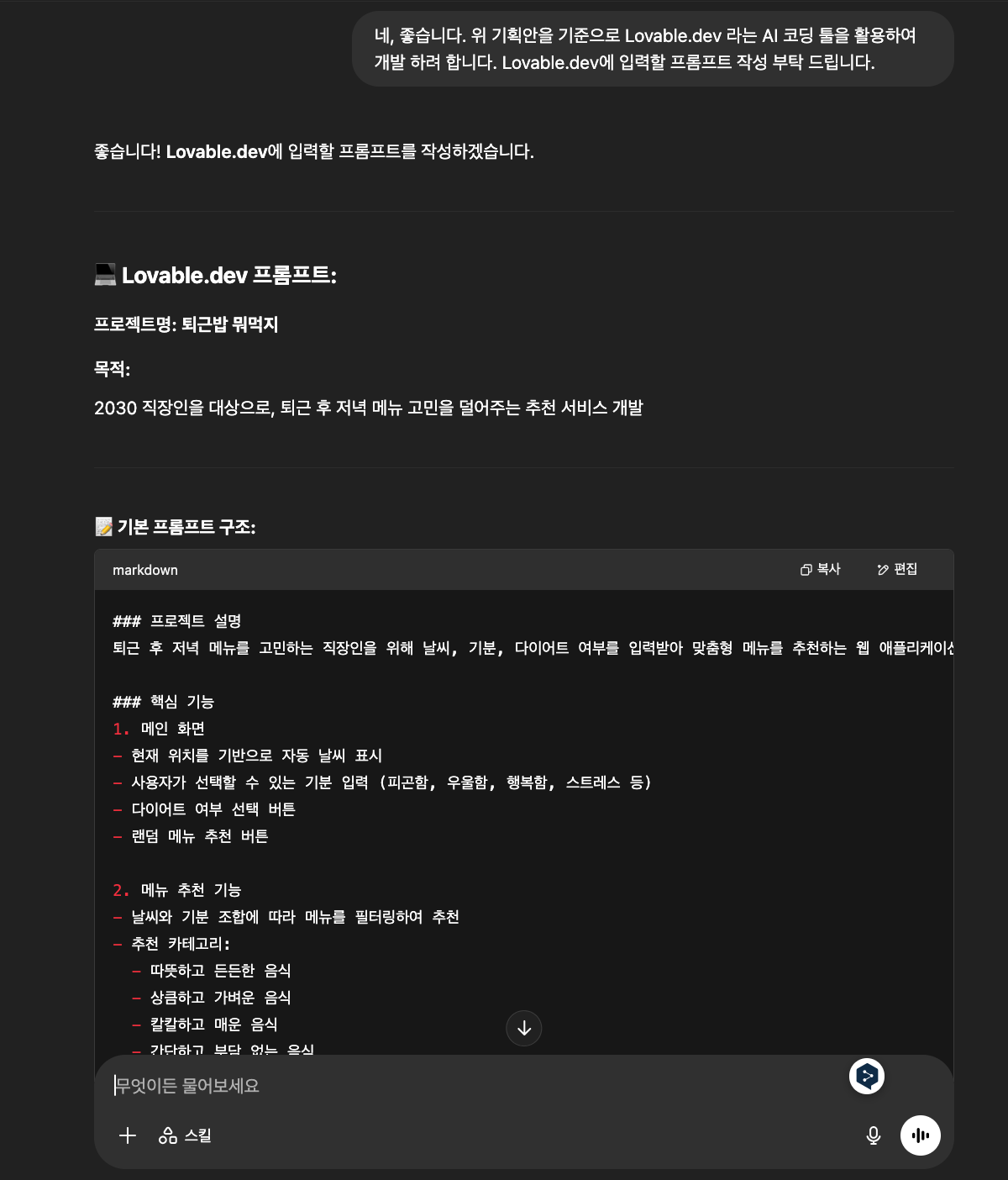 최종 발전시킨 기획안을 토대로 ChatGPT에게 Lovable에 입력할 프롬프트를 만들어 달라고 요청했어요. <퇴근밥 뭐 먹지> 구축을 위한 프롬프트가 금방 나왔고, 이를 바로 Lovable에 입력했습니다. Lovable은 기본적으로 한국어 지원이 되는데요, 한국어로 프롬프트를 입력했는데, 프리뷰 창을 통해 바로 제가 생각한 서비스가 구현되는 것을 확인할 수 있었습니다. 비개발자 입장에서 매우 편리하더라고요!