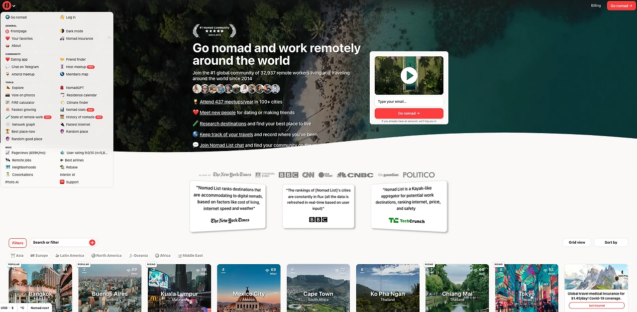 그의 대표작은 각 나라별 원격근무 정보를 제공하는 웹사이트 Nomad List입니다. Nomad List의 월 방문자 수는 2024년 1월 기준, 약 66만 명에 달하며 2023년 연간 매출 $704,200(한화 약 9억 이상)를 기록하고 있어요!