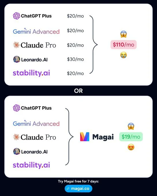 그는 Chat GPT를 비롯한 여러 AI 서비스들의 API를 구매해 Magai에 탑재 후 고객들이 각 AI 서비스를 개별 결재해 사용하는 것보다 훨씬 더 저렴한 구독료로 이 모든 AI 서비스를 사용할 수 있도록 했습니다.