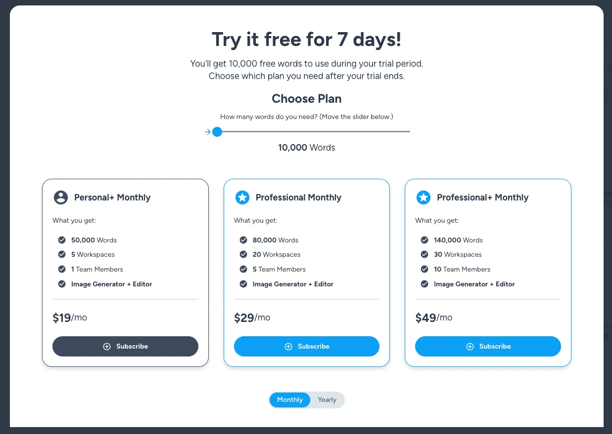 7일간은 무료로 사용할 수 있으며 이후 작성 가능한 단어 수, 초대하려는 팀원 수 등에 따라 다양한 유료 플랜이 적용되는 형태죠.