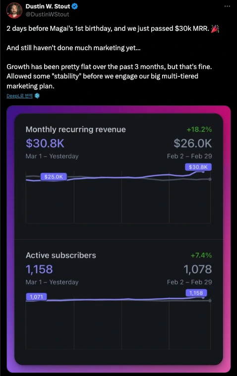 그렇게 약 6개월이 지난 163일, Magai로 월 고정 수익 $20,000를 달성합니다. 출시 1년이 지난 2024년 3월에는 월 고정 수익 $30,000(약 4,000만 원)을 달성하며 꾸준한 성장세를 이어가고 있어요!