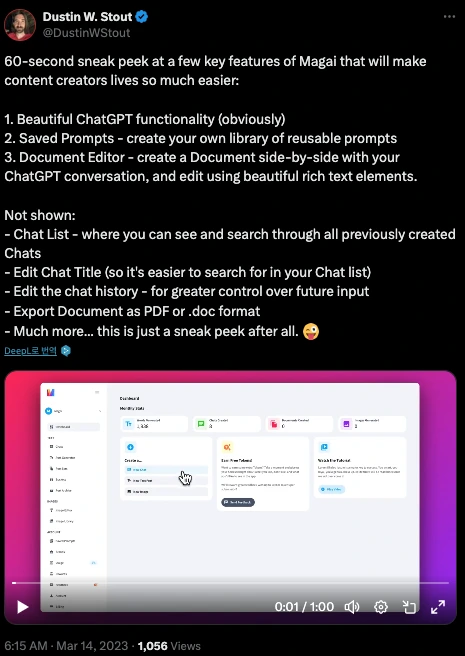 이는 개발자 출신이 아닌 그가 본격적으로 시장을 공략하기 전 최대한 제품 퀄리티를 높이기 위한 방법 중 하나였습니다. 무엇보다 더스틴은 10년 넘게 온라인에서 입지를 다져온 탓에 Magai를 공개적으로 구축했을 때 이를 지켜볼 잠재 고객이 충분하다는 것을 알고 있었죠.
