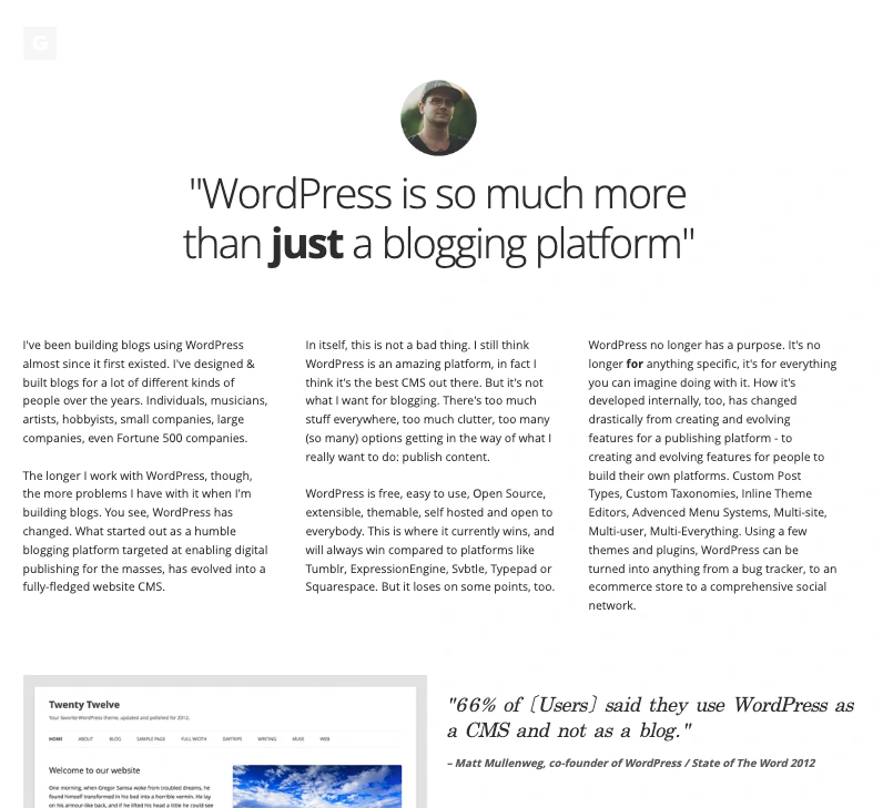 덕분에 그는 워드프레스가 작은 블로그 플랫폼에서 웹사이트 CMS(콘텐츠 관리 시스템)로 성장하는 모습을 지켜볼 수 있었습니다.