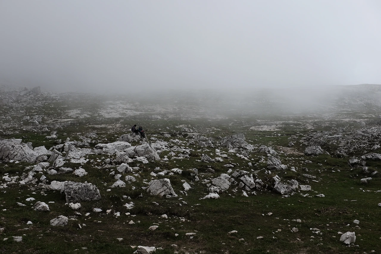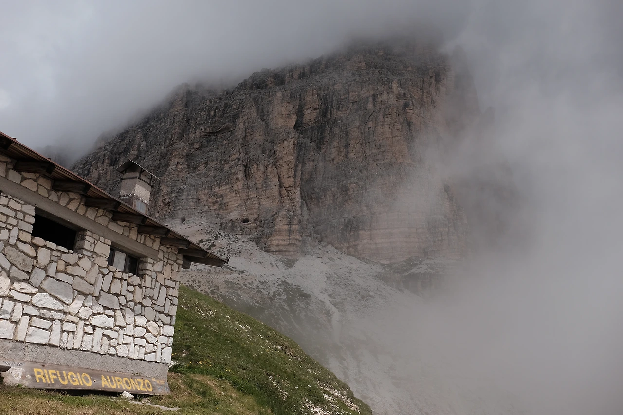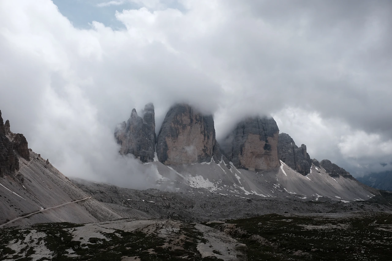 몇 분 걸었을까, 1차 세계대전 당시 희생자들을 기리는 작은 교회를 지난다. 이 거친 지역을 장악하기 위해 오스트리아와 이탈리아의 산악부대가 목숨을 잃은 그 길, 구름을 야속해하며 걷는다. 라바레도 산장Rifugio Lavaredo을 지나 트레치메 디 라바레도 옆을 넘는 고개에는 지난겨울에 내렸을 눈이 남아있다.