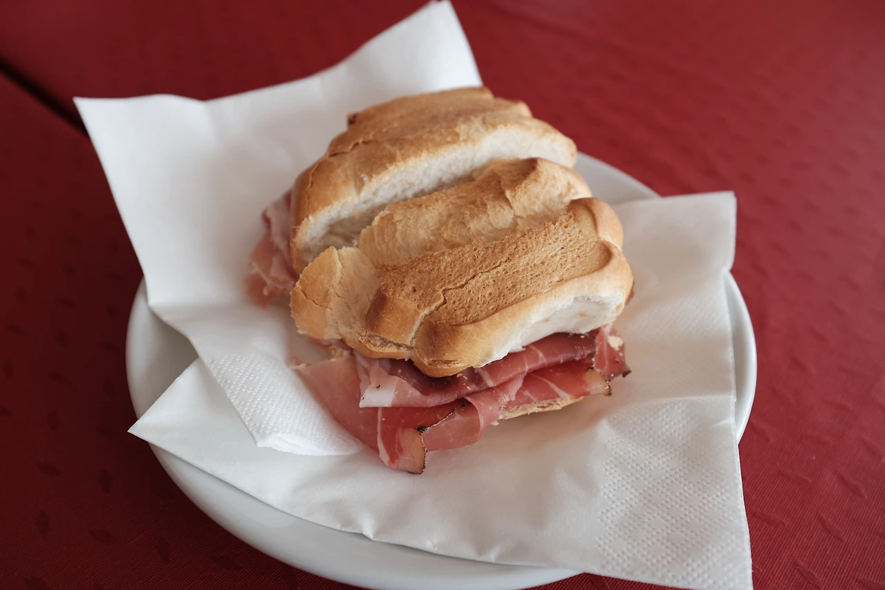 이곳의 산장은 우리나라의 산장(대피소)과는 다르다. 숙박은 물론 식사도 가능하다. 점심시간이 애매하여, 출발지인 아론조 산장에서 간식 같은 점심을 먹었다. 제아무리 짧은 거리의 트레킹이어도 먹어야 걸을 수 있다. 바케뜨만큼 딱딱한 빵을 갈라 프로슈또를 몇 장 넣었는데 먹을 만하다.