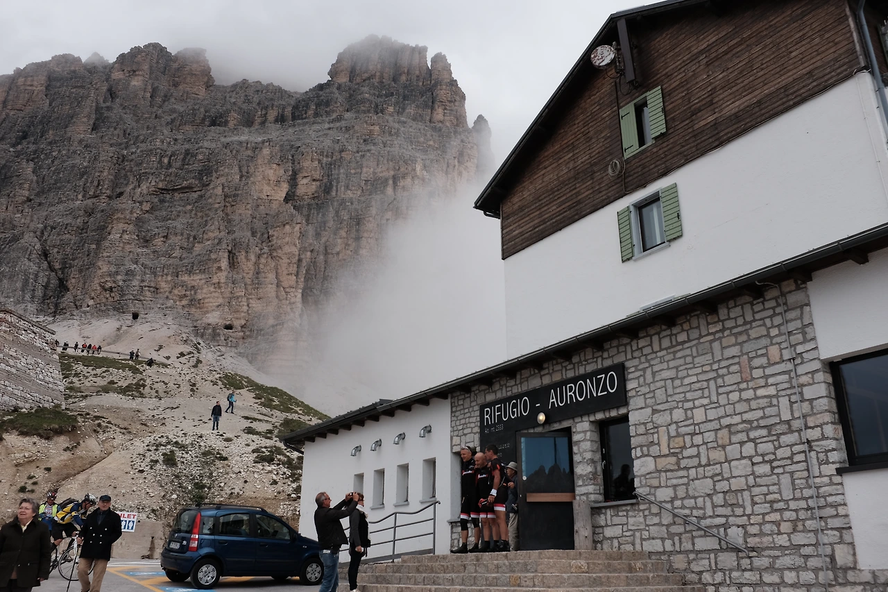 하룻밤을 머문 코르티나 담페초Cortina d'Ampezzo에서 아론조 산장Rifugio Auronzo까지 버스로 약 1시간 이동한다. 버스의 엔진은 무척 힘이 좋고 부드러워 경사가 급한 길을 소리 없이 오른다. 이에 질까 거친 숨을 내쉬며 터질듯한 허벅지들이 페달을 밟고 오른다. 이곳 구비구비 거친 산길엔 사이클 하는 사람들이 많은 편이다.