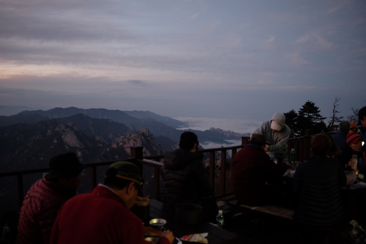 백담사에서 아침에 느린 산행을 시작해 도착하는 소청대피소는 저녁식사 준비로 분주하다. 겨울이 아니라면 무조건 대피소 앞 바깥 테이블에 버너와 코펠을 깔아야 한다. 친절한 직원도 없고 깨끗한 식탁보도 없다. 설거지를 할 수도 없고 쓰레기는 도로 배낭에 넣어야 한다. 그럼에도 햇반에 라면만을 끓여 먹어도, 이곳은 그 어느 곳과 견주어도 뒤지지 않을 식당이다. 서북능선 뒤로 떨어지는 해를 보며, 해거름에 차츰 어두워지는 내설악을 보며 밥을 먹는다. 구름이라도 낮게 깔리는 날엔 더할 나위 없다. 7시간 산행이 주는 선물이다. 이곳은 천상의 레스토랑이다.