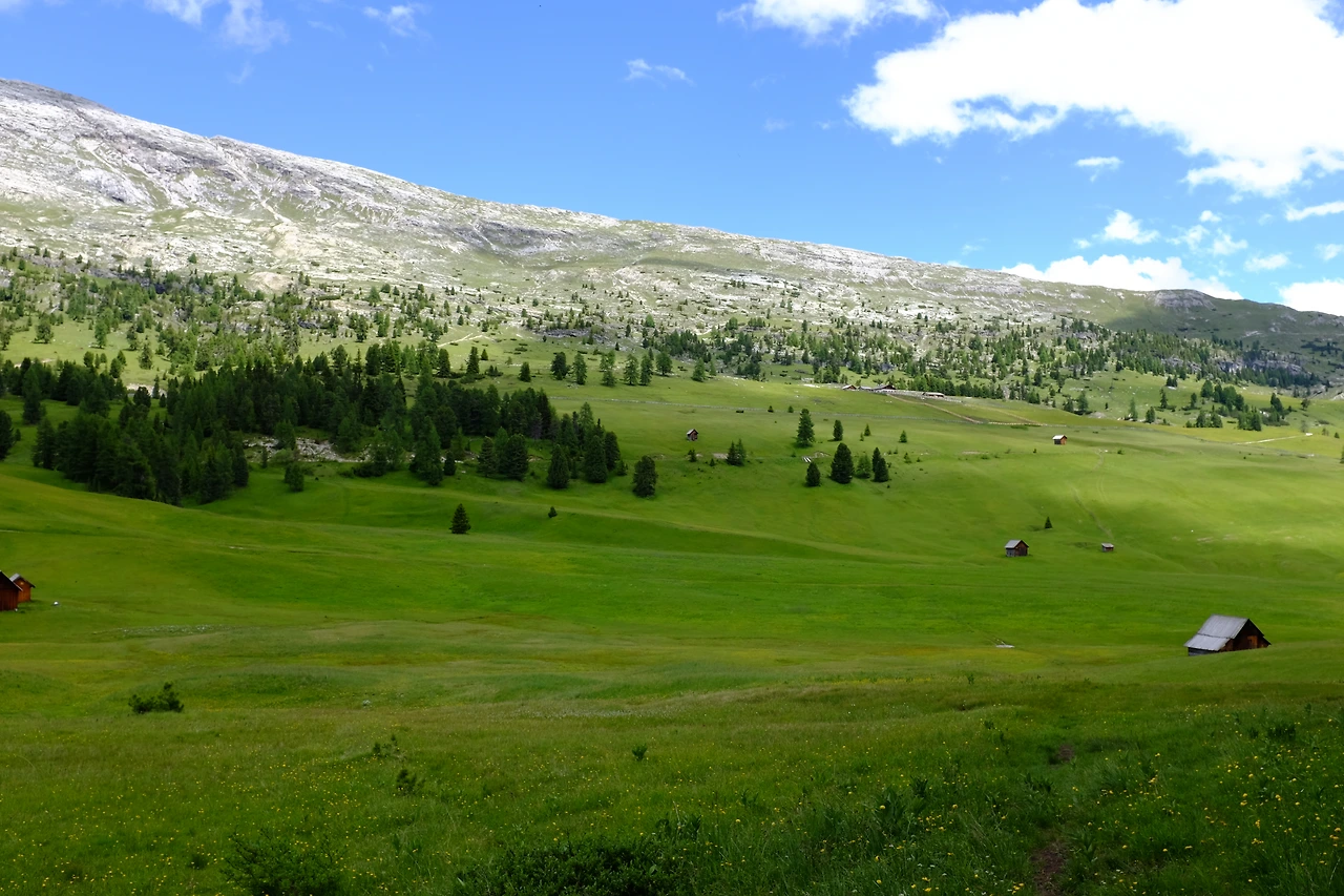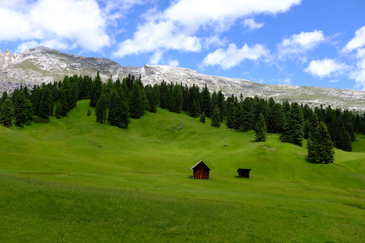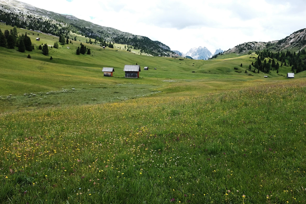 평탄한 길을 걷다 20분 정도 오르막을 치고 오른다. 방금까지도 흰 바위 투성이 계곡이었는데 갑자기 푸른 초원이 펼쳐진다. 프라토 피아자Prato Piazza다. 초원 광장이라는 뜻인데, 이발소 달력에서 볼 법한 장관이다. 야생화가 피어 있는 푸른 초원 끝엔 눈 쌓인 봉우리가 있는, 뭐 그런 사진. 나란 존재가 이곳에 있다는 게 어색하다. 돌로미테의 선자령이라고 해야 할까. 이곳은 해발 2,000m다.