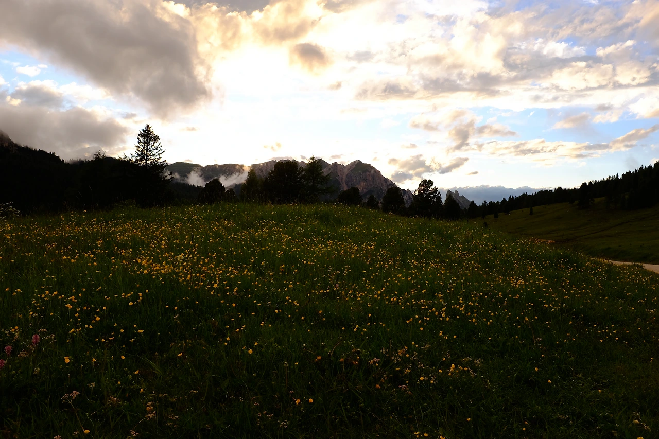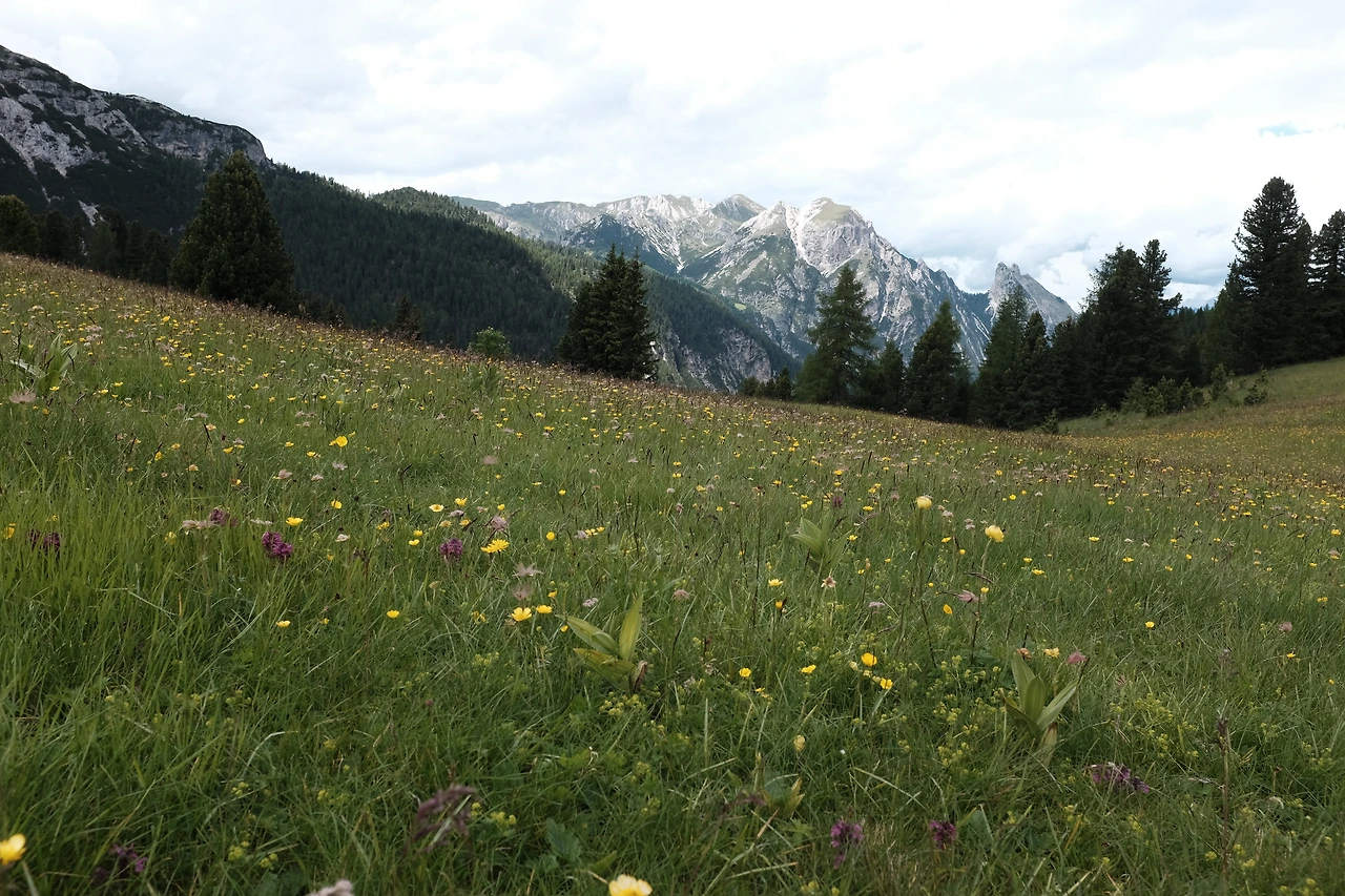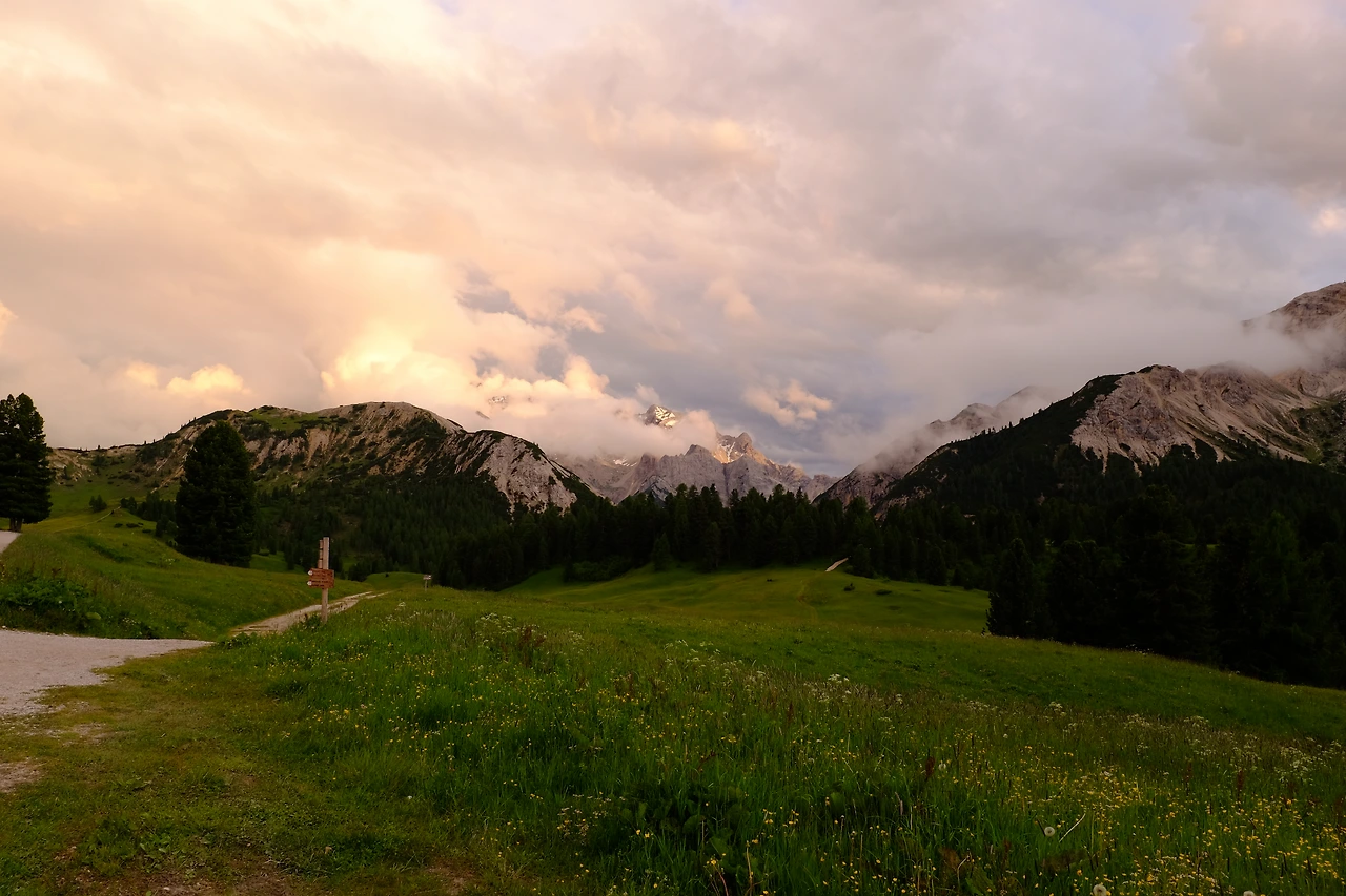 평탄한 길을 걷다 20분 정도 오르막을 치고 오른다. 방금까지도 흰 바위 투성이 계곡이었는데 갑자기 푸른 초원이 펼쳐진다. 프라토 피아자Prato Piazza다. 초원 광장이라는 뜻인데, 이발소 달력에서 볼 법한 장관이다. 야생화가 피어 있는 푸른 초원 끝엔 눈 쌓인 봉우리가 있는, 뭐 그런 사진. 나란 존재가 이곳에 있다는 게 어색하다. 돌로미테의 선자령이라고 해야 할까. 이곳은 해발 2,000m다.