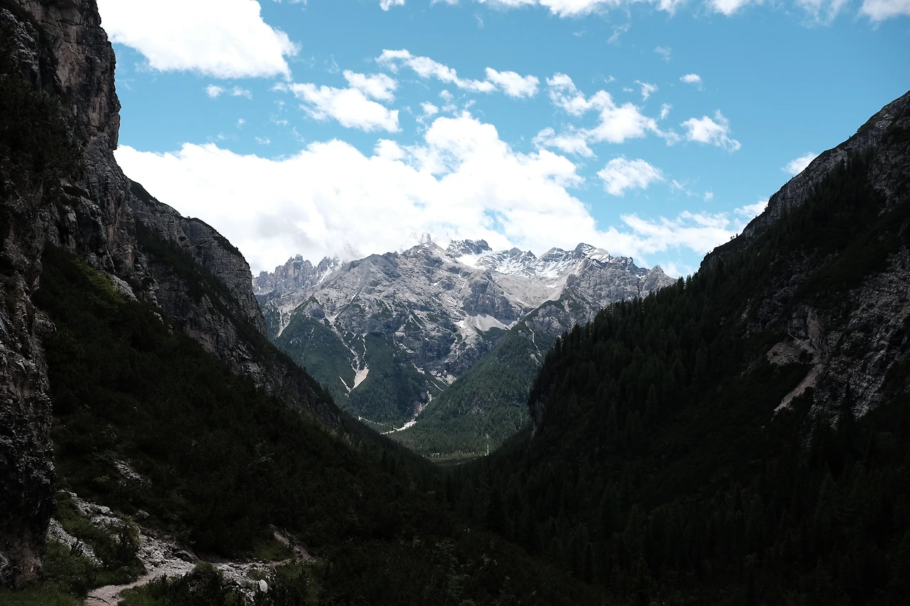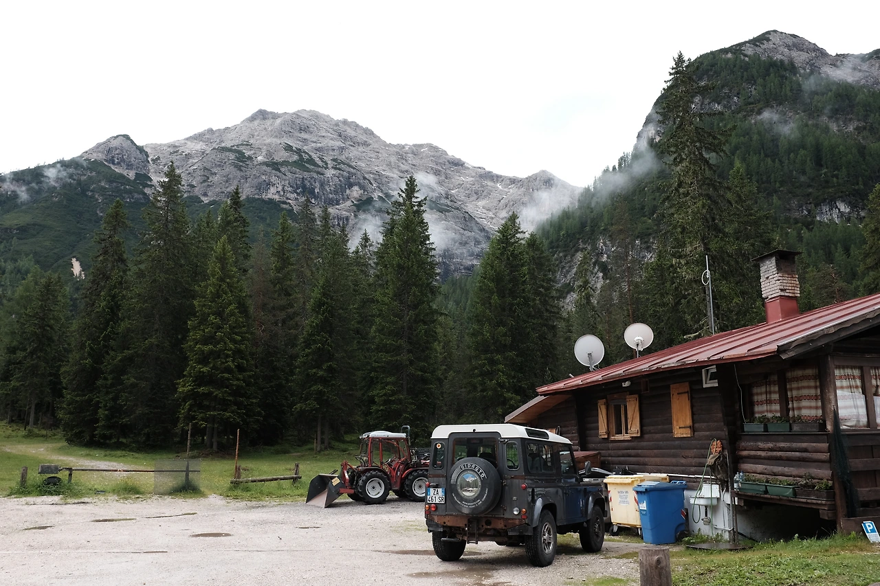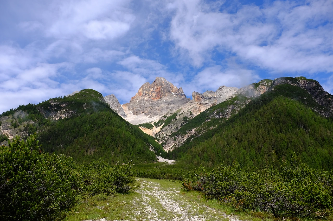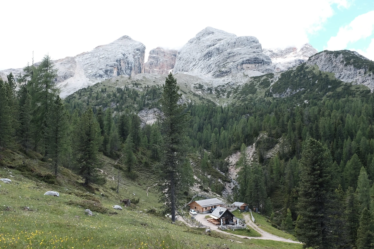 숙소이자 목적지는 2시간 정도 걸리는 피아자 산장Albergo Prato Piazza이다. 크로다 로사 산군Croda Rossa을 왼편에 두고 계곡을 따라 오른다. 뒤로는 눈 덮인 크리스탈로 산군Cristallo이 웅장하다.
