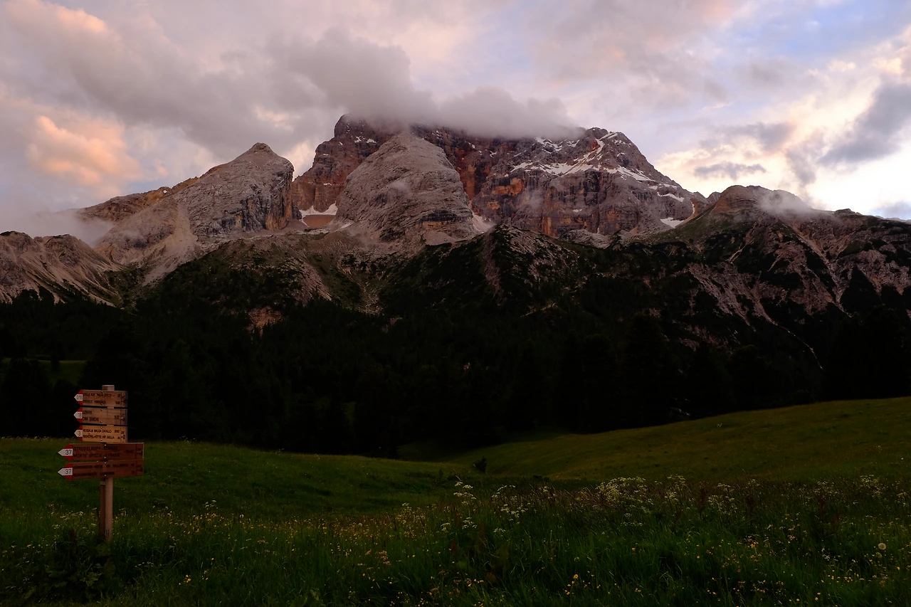 전날도 느꼈지만 이곳 풍광에는 거리감이 없다. 도무지 높이와 거리를 가늠하기가 어렵다. 숙소인 피아자 산장 뒤로 솟은 산을 보며 저기 가보면 좋겠다고 하니, 왕복 5~6시간은 걸릴 거라 한다. 산장 의자에 앉아 지도를 펴보니 해발 2,839m 봉우리Picco di Vallandro다. 하기야 산장 앞에 떡하니 버티고 있는 크로다 로사는 해발 3,146m다. 우리나라와는 달리 광활한 대지에 솟은 바위 봉우리라 그럴 수도 있겠다 싶다. 산맥이 아니라 산군이라는 표현도 이곳에 와서 처음 들었다.