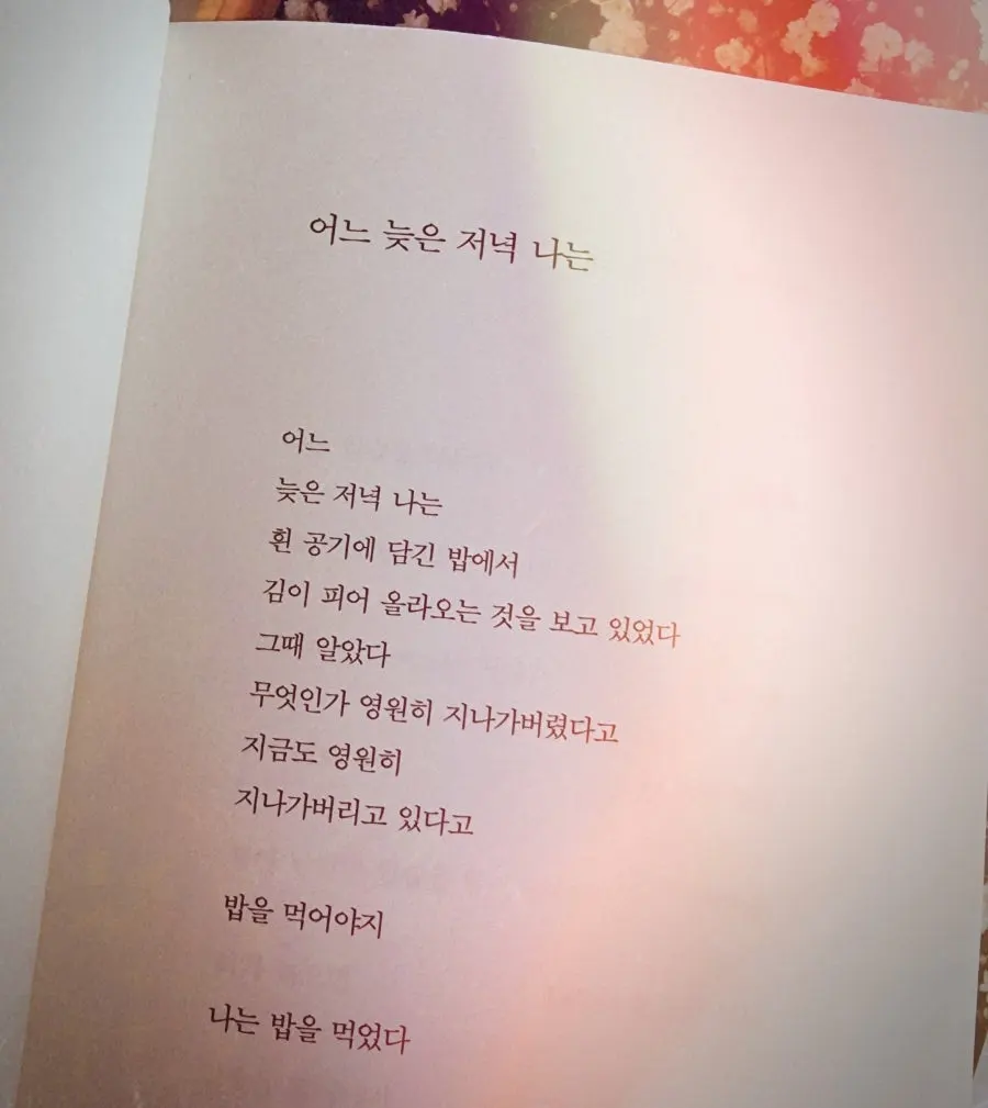 더 이상 어두워지지도, 다시 밝아지지도 않는 저녁 속에서 우리들은 밥을 먹고, 걸음을 걷고 잠을 잡니다.