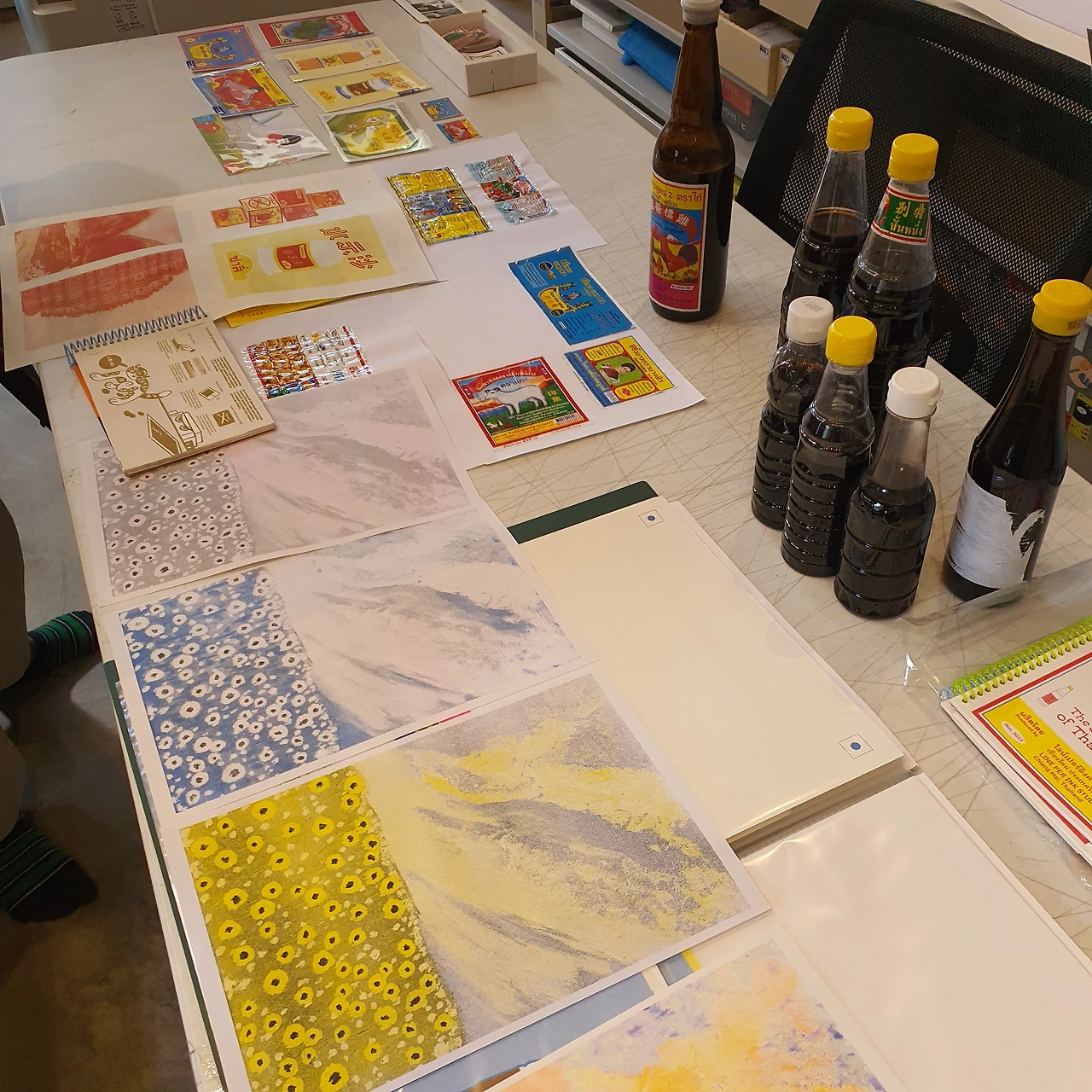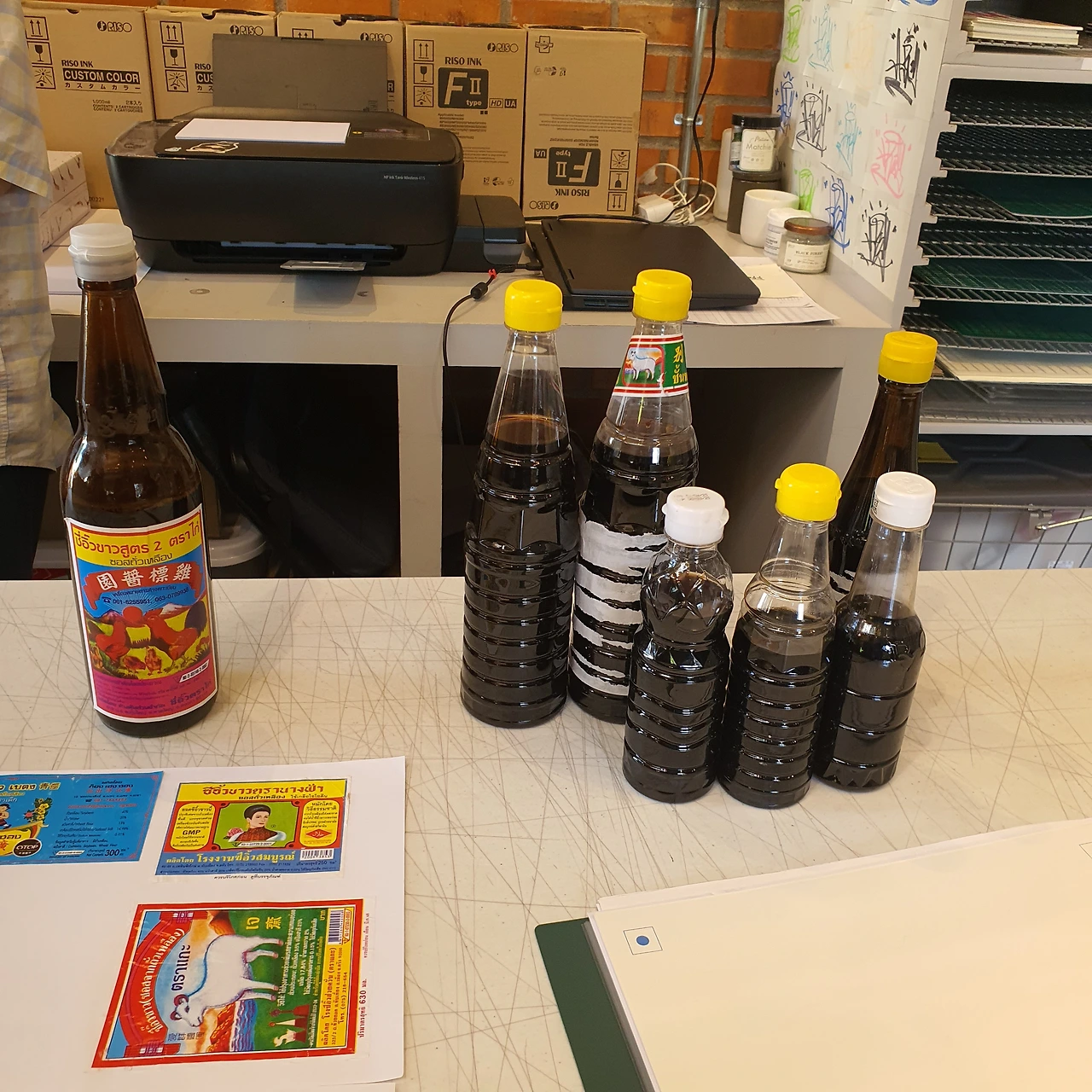 나를 이곳으로 이끈 “Soy Sauce from The Southern of Thailand”라는 책은 디자이너 ‘Bogie’의 작품 중 하나다. 건축을 전공한 ‘Bogie’는 중국계 태국인으로 자기 뿌리와 맞닿아 있는 중국식 건축 양식에 관심이 많았는데, 자기 뿌리에 대한 관심이 남부 지역 곳곳에 남아 있는 로컬 소스로까지 이어졌다고 한다. 태국에 중국인 이민자들이 많이 이주해 오면서 다양한 소스와 조미료 문화가 함께 들어오게 되었기 때문에 ‘Bogie’와는 상당히 밀접한 관련이 있는 주제라는 생각이 들었다. 태국에는 여전히 초창기 이주 시절부터 만들어진 소스가 많이 남아 있고 이 중 몇 개는 대형 마트에서도 구하기 쉽지 않은 경우가 많다. 이 책도 각 지역에서 생산되고 있는 ‘지역 간장’에 대한 내용이 담겨 있다. 소스마다 가지고 있는 특색 있는 라벨 디자인을 확인할 수 있고 어느 지역 소스인지, 재료는 무엇인지도 볼 수 있다. 책에 삽입되어 있는 라벨지 일러스트는 라벨의 본모습을 헤치지 않으면서 좀 더 세련되게 디자인되었다. ‘Bogie’가 책 작업 과정을 설명해 주면서 A4용지에 붙여둔 간장 라벨지를 보여주었다. 간장병에서 라벨을 떼어 종이에 붙이고 스캔해서 디자인하고 리소프린팅 방식으로 인쇄했다고 한다. 종이에 붙어있는 라벨을 보니 “나도 이런 작업을 해보고 싶다!”는 생각이 강하게 들었달까? 책을 만들기 위해 함께 일하는 동료들과 간장 시식도 진행했다고 하는데 한 분은 너무 많이 먹어서 질려버린 것처럼 보일 정도였다. 나도 책에 수록된 간장 몇 개를 맛볼 기회를 얻을 수 있었다. 처음에 너무 용감하게 간장을 쭉 짜서 그걸 지켜보던 사람들이 아주 당황할 정도였다. 총 3종류를 먹어보았는데, 신기한 건 다 맛이 달랐다. 어떤 건 좀 달고, 어떤 건 정말 너무 짜고, 어떤 건 새콤하고 그랬다. 태국 남부 간장도 먹어보고 너무 재미있는 경험이었다.
