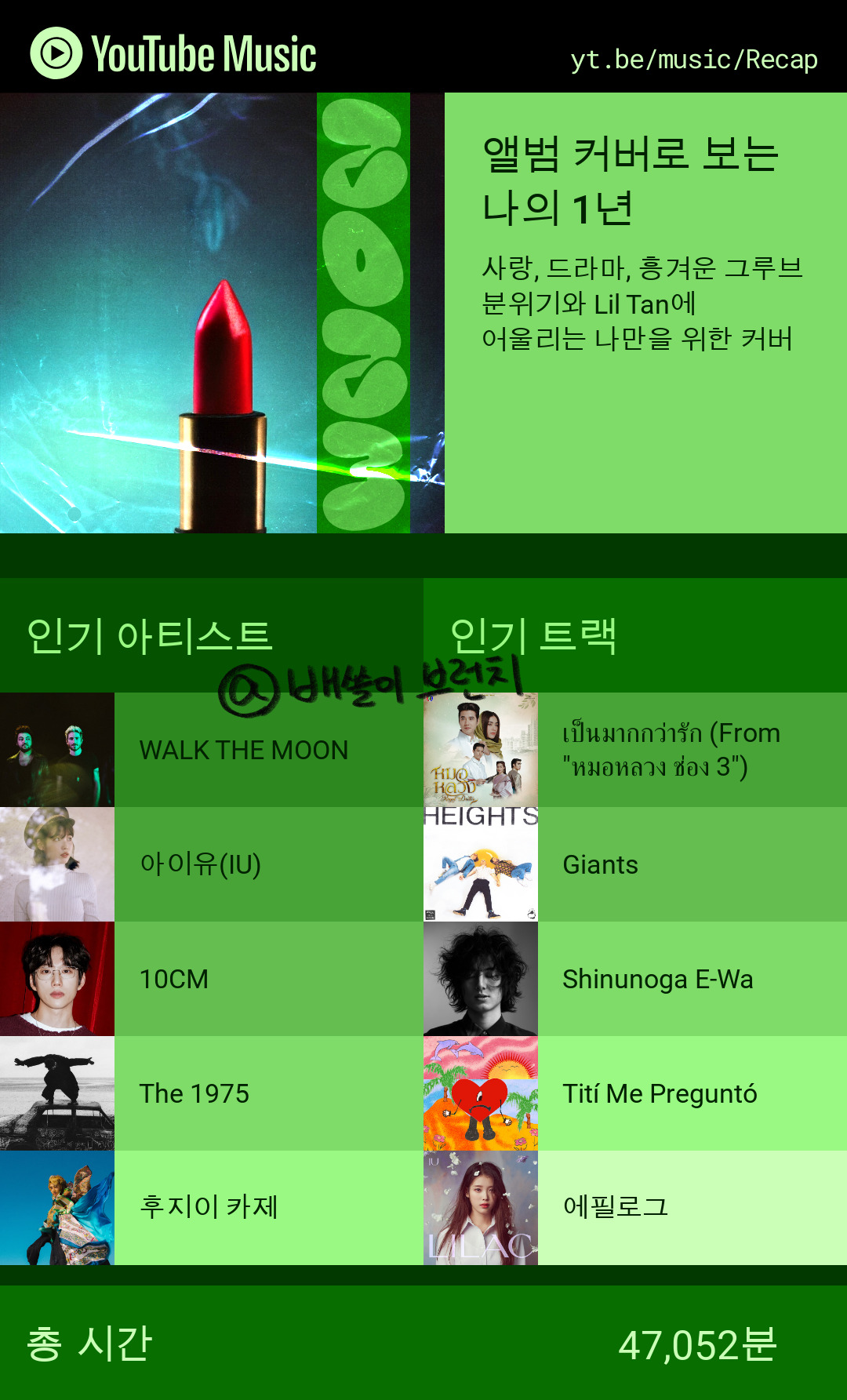 2023년의 마지막 달, 유튜브뮤직에게서 어김없이 2023 요약이 도착했다. 내가 1년 동안 가장 많이 들은 음악은 무엇인지, 어떤 장르, 어떤 가수의 노래를 가장 많이 들었는지, 1년에 몇 시간이나 노래를 들었고, 몇 곡이나 들었는지를 상세하게 요약해서 보여준다. 1년 동안 가장 많이 들은 음악을 보니 이 노래와 연관된 이야기를 하지 않을 수 없다.