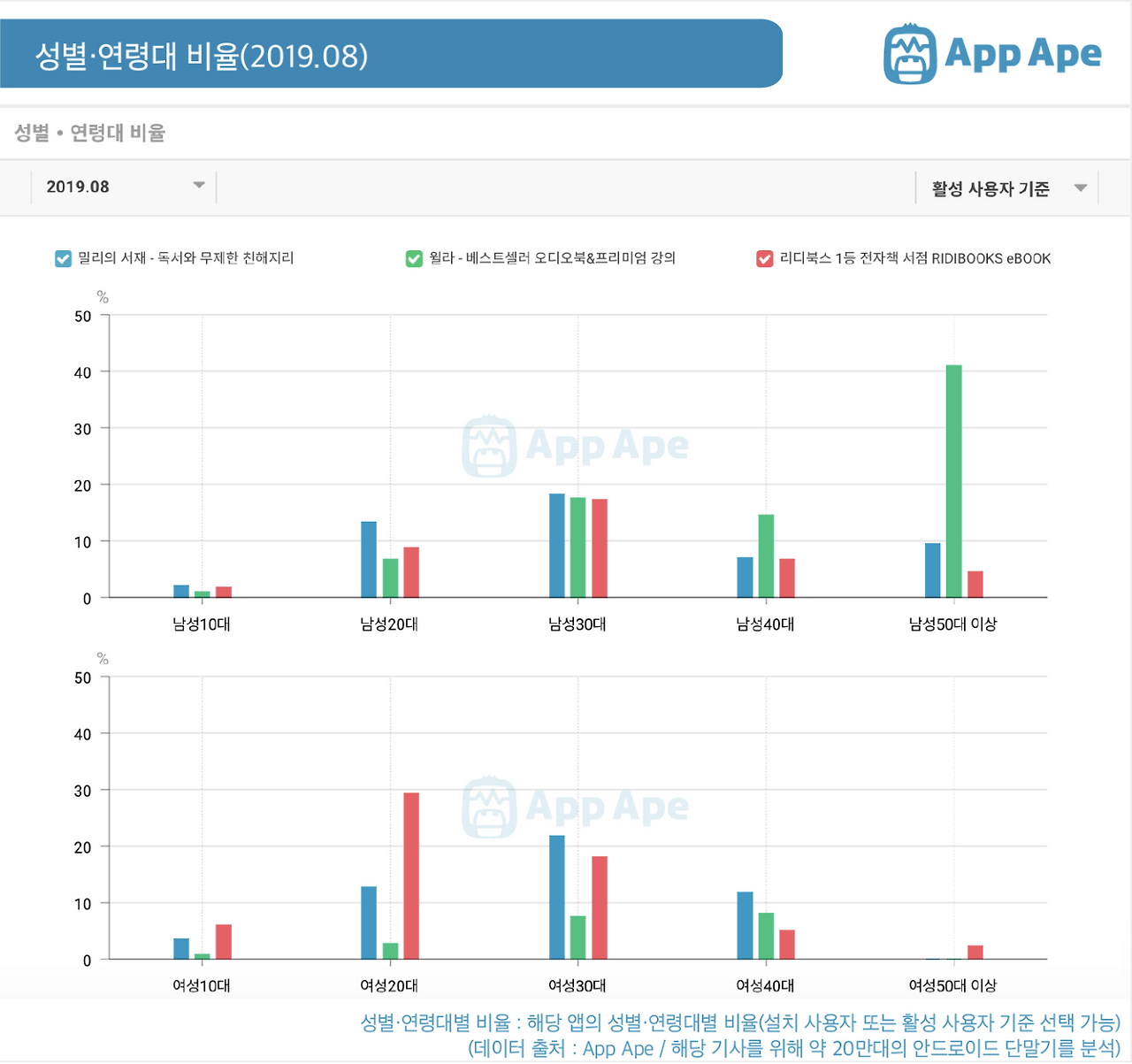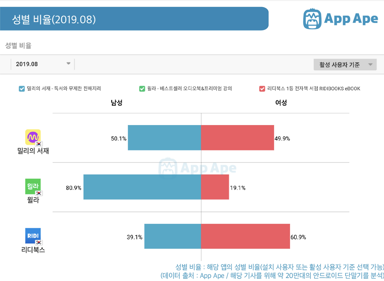 2019년도 기준 리디북스 전자책 분야 이용자 성별은 여성이 60.9%, 남성이 39.1%로 여성이 훨씬 많은 비중을 차지하고 있음을 알 수 있다. 물론 아래 통계는 일반 전자 도서를 제공하는 리디 셀렉트와 웹소설/웹툰을 제공하는 파트가 합쳐진 통계라 여성을 웹소설 주요 유저로 보는 것은 비논리적이지 않을까? 싶지만