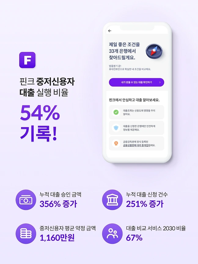 핀크는 지난해 11월(표준 API 적용 전) 대비 마이데이터 이용자가 300% 증가했으며, 모바일 앱 누적 다운로드 수가 1000만 건을 돌파했다. 또한 핀크는 기존의 대출 기준 대신 통신 데이터 기반 대안 신용평가 모델 ‘T스코어’를 앞세워 맞춤형 대출을 한 번에 찾아 보여주는 ‘대출 비교 서비스’와 소액 대출을 지원하는 '번개 대출'을 앞세워 22년 1월 기준 누적 대출 승인 금액 33조 원을 달성했고, 제휴사 수는 33곳으로 94% 증가했으며 상품수는 89개로 141% 증가했다. 제1 금융권을 비롯해 2,3 금융권이 각각 모바일뱅킹 서비스를 제공하고 있고, 대출 전문 핀테크 기업과 보험 전문 핀테크 기업이 전문적인 서비스를 제공하고 있는 핀테크 업계에서 핀크는 국내 굴지의 통신 대기업과 제1금융권의 만남으로 다양한 금융 상품과 우대금리로 소비자들을 유치하고 있다.