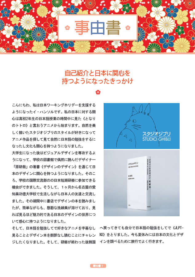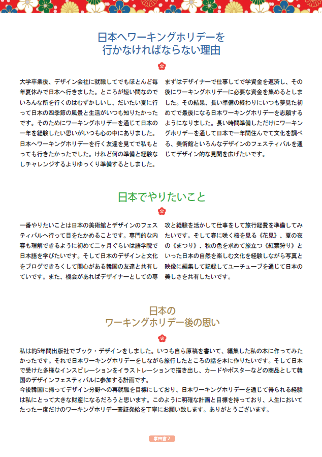 내용을 대략적으로 해석하면, 어릴 때부터 일본의 애니메이션에 관심이 많았다. 시각디자인을 전공해서 일본의 디자인에도 관심이 많아서 일본어를 독학으로 공부해왔고, 여행도 자주 갔다. 그러나 지원이 늦어진 이유는 그동안 학자금 대출을 갚고 있었고, 아무런 준비 없이 워킹홀리데이를 갈 수는 없어서였다. 만약 뽑아준다면 그동안 한국에서 일을 한 경험을 살려 영상과 글을 통해 일본의 문화를 소개할 것이다. 그리고 워킹홀리데이 기간 종료 후엔 반드시 한국으로 돌아가 일본에서의 경험을 책과 디자인으로 풀어낼 것이고, 원래 일했던 분야로 재취업을 할 생각이다. 그러니 생의 처음이자 마지막이 될 워킹홀리데이를 허락해달라.