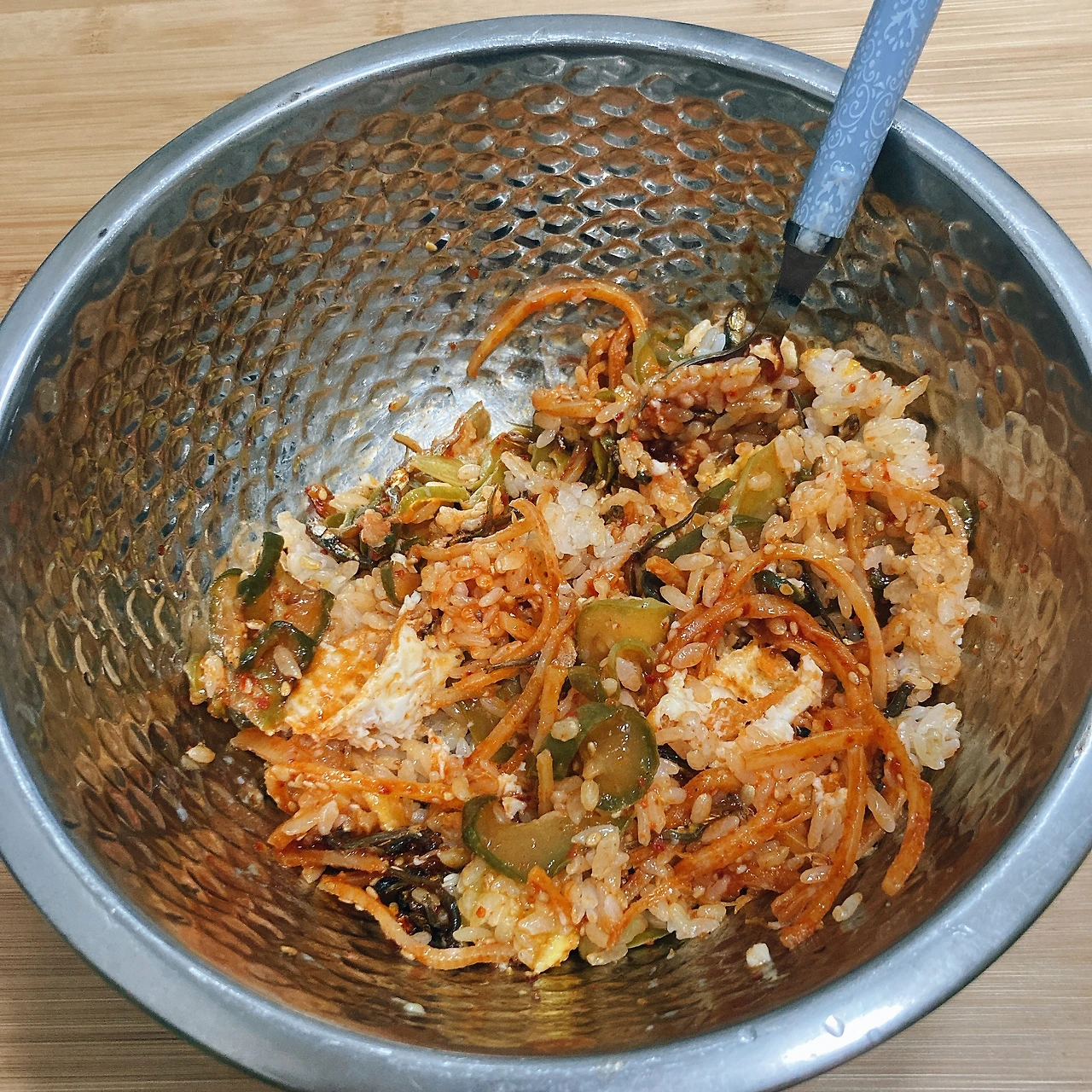 시장이 사라진 지금, 남은 해답은 하나였다. 엄마와의 화해. 주말에 엄마 집에 가서 비빔밥으로 쓸 반찬들을 조금씩 훔쳐왔다. 싫어하는 도라지나물은 과감히 빼고 내가 좋아하는 오이지, 멸치, 오징어채를 가져왔다. 쓱쓱 비비다가 너무 색이 진하다 싶으면, 밥을 더 넣고, 색이 너무 연하다 싶으면 반찬을 더 넣고. 마치 미술 공부하는 것처럼 색상을 조절할 수 있는 게 비빔밥의 매력 같다. 모든 것은 살로~