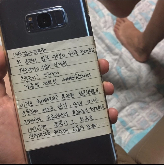 토익 시험을 끝으로 그의 사생활이 마무리 되나 싶었는데, 놀랍게도 지금부터가 진짜 시작이다. (2017) 하루는 아빠가 핸드폰을 바꿨다면서 쓱 내미는데 희한한 케이스가 먼저 눈에 들어왔다. 노트 모양의 폰케이스인가? 자세히 보니 날렵한 글씨가 쓰여있다. ‘내부 감사 직무란 한 조직의 업무 수행의…’ 뭐야 아빠 글씨잖아!