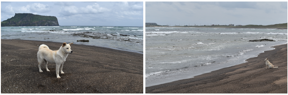 광치기 해변에 도착했는데 아침부터 바람이 많이 불더니 날이 흐리다. 바람도 엄청 불고. 약간은 실망한 채 바닷가를 거니는데 백구 한 마리가 쫄래쫄래 나를 따라온다. 활기차게 여기저기 뛰어다니던 녀석이 바다 가까이 가더니 바닷물을 할짝인다. '어... 너 그거 먹으면 목만 더 마를 텐데...'싶어서 가방 안에 있던 반쯤 남은 물을 꺼내 들고 소심하게 백구를 불렀다.