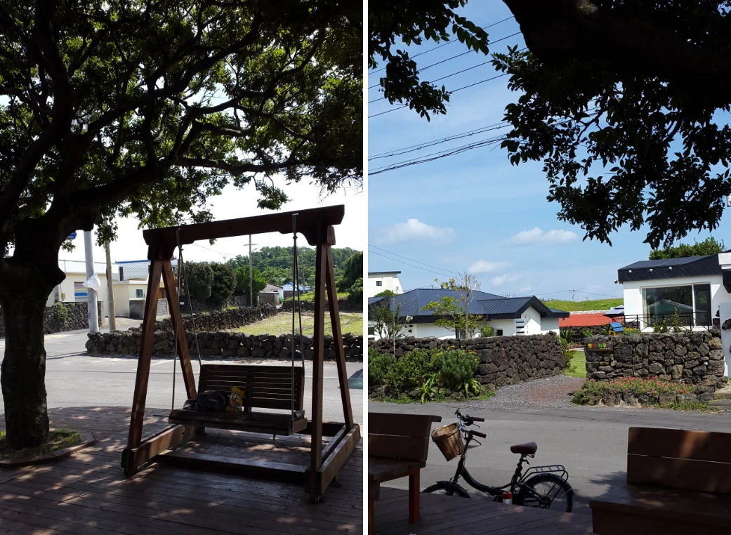 게스트 하우스를 다시 지나 마을 안쪽 길로 접어드니, 큰 나무 세 그루 아래 쉼터가 있다.