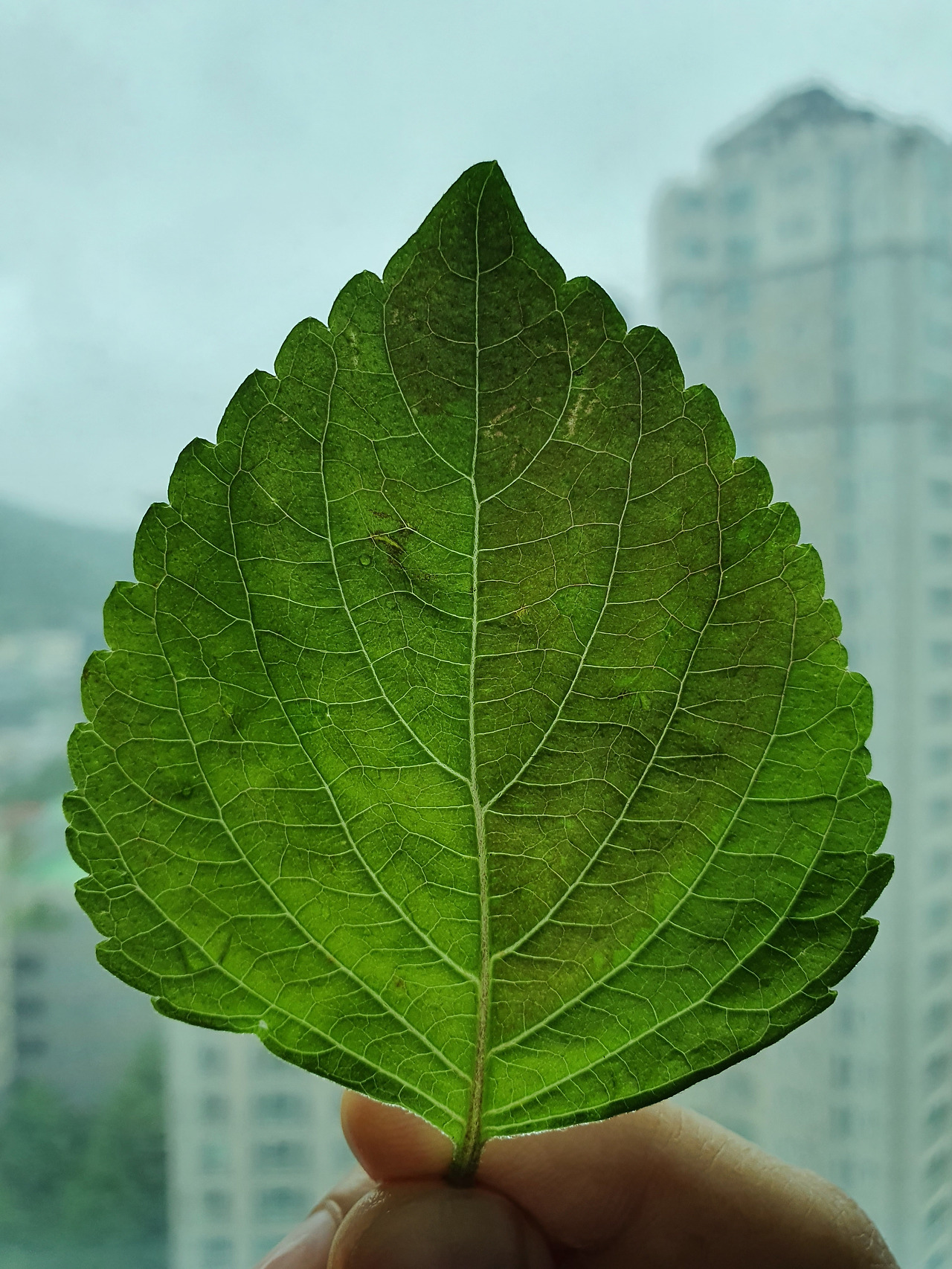 깻잎, 노지 깻잎은 아직 아기 손바닥만 한 크기다.
