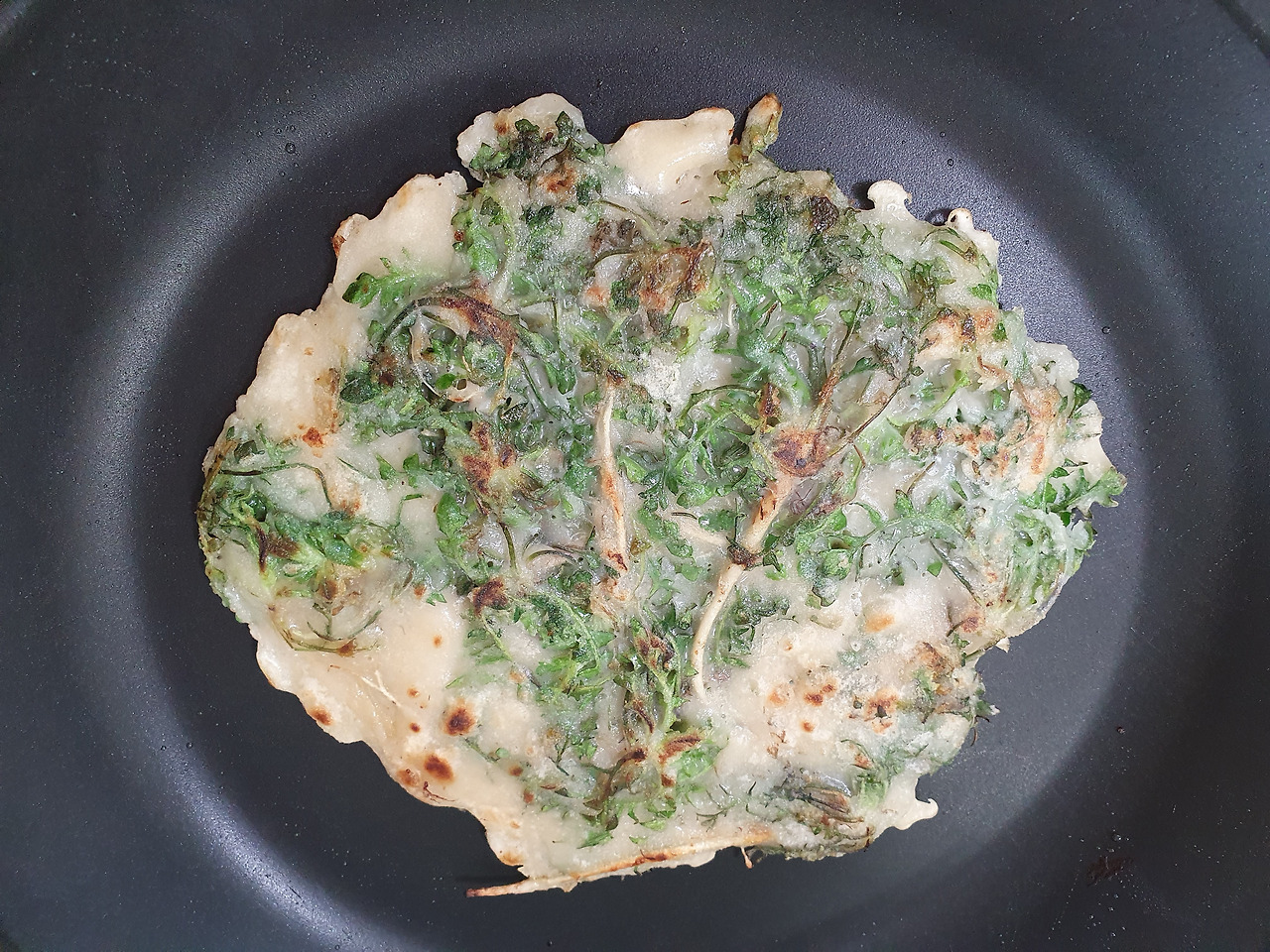 아, 이 것도 맛있다. 밀가루 반죽에 잘 씻은 냉이 던져놓고 기름 두른 팬에 노릇노릇 부친다.