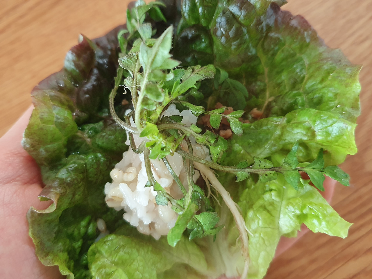 뭐 딴 게 필요 없다. 상추에 냉이 하나, 밥 한 숟가락, 된장이나 쌈장 쪼오금, 끝.