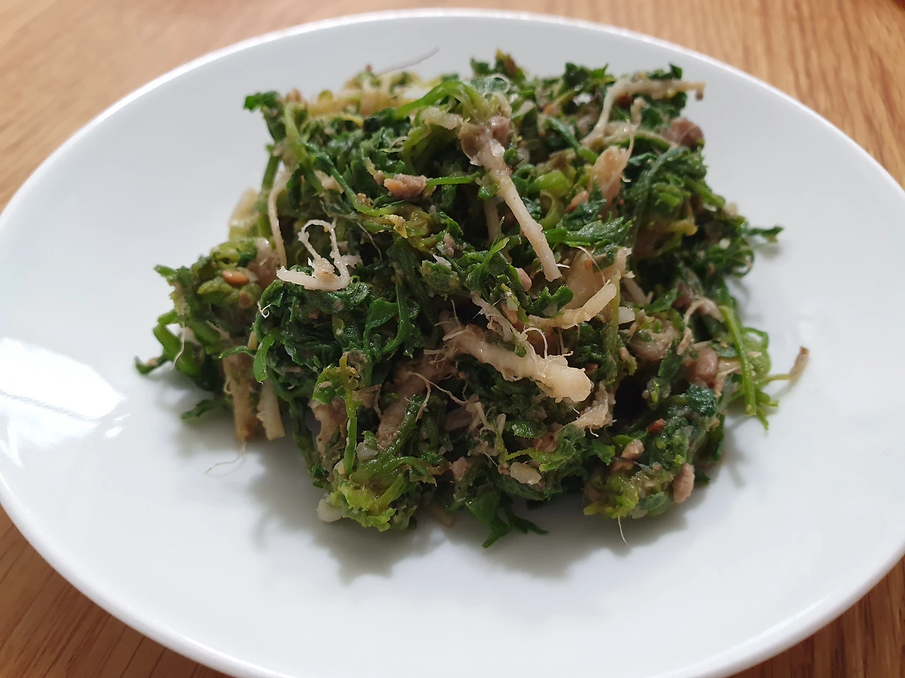 소금 살짝 넣은 물에 데친 냉이에 된장과 다진 마늘을 조금 넣고 바락바락 무친다.