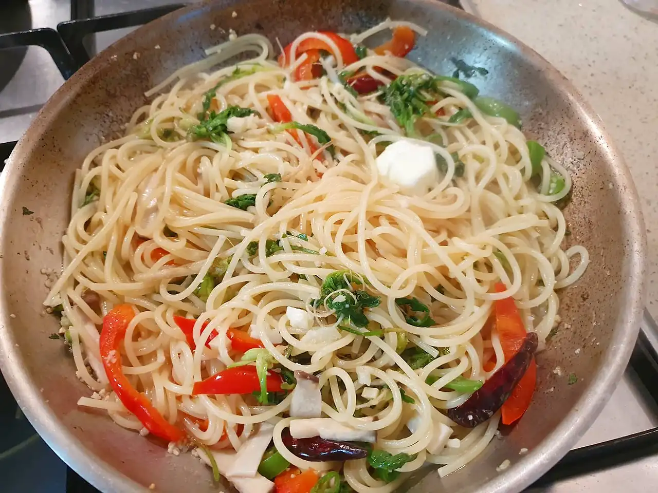 마늘을 올리브유에 볶다가 살짝 데친 냉이(봄나물)와 다른 재료를 넣고 한 번 섞은 후 삶은 파스타를 더해 볶다가 마지막에 버터 한 숟갈을 넣으면 끝.