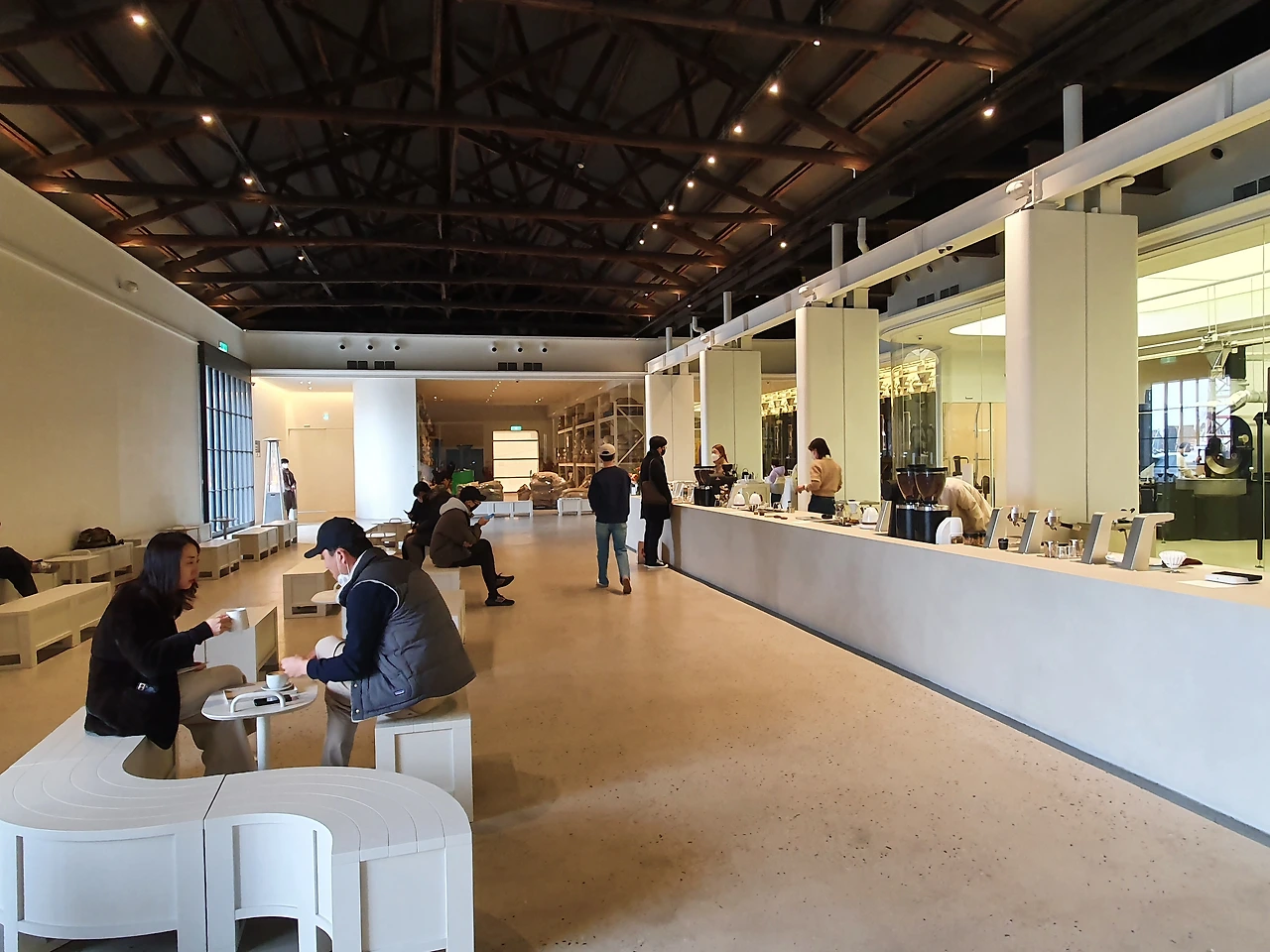 영도점의 시스템은 은행 같다. 입구에 들어서며 대기를 걸고, 내 순서가 되면 내 담당 바리스타 분의 스테이션에 가서 주문을 한다. 주문을 하기 전에 충분히 메뉴에 대한 설명을 듣고, 커피를 준비하는 과정에서도 계속 커뮤니케이션이 된다. 1:1 시스템이라 대기 시간이 길 수밖에 없는데, 대기 시간에는 커피가 그린빈으로 들어와서 가공되고 포장되는 전 과정을 (온라인) 도슨트와 함께 감상할 수 있다.