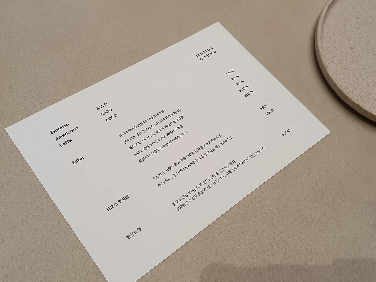 평일 저녁, 한산한 무렵에 방문한 나는 이것저것 사느라 질문이 많았는데, 나를 대응해주신 바리스타 분뿐 아니라 그 주변에 있던 모든 분들이 나의 커피 호기심을 반가워하고 하나라도 더 알려주려는 분위기였다. 이 사람들은 자기가 하는 일을 어쩜 이렇게 좋아하고 알리고 싶어 할까 하는 생각이 들었다. 커피, 베이커리, 공간도 모두 좋았지만 무엇보다도 그런 분위기가 좋아서 부산에 올 때마다 모모스에 들렀다.