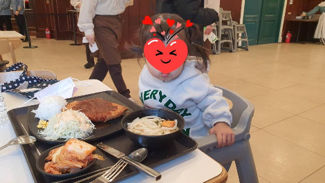 감사한 마음으로 후기를 듣는데 남편이 '그런데 가장 신기했던 게 뭔지 알아?' 하며 말을 꺼냈다. 뭐냐고 물으니, 애랑 아빠랑 식당에서 단 둘이 밥을 먹은 풍경이란다. 다들 가족 단위로 와서 북적북적한 가운데 둘이만 부녀 간이었다고. 게다가 딴 집은 다들 유튜브 하나씩 켜놓고 먹는데, 딸내미는 그런 걸 보지도 않고 자기랑 맛있게 싹싹 다 먹었다고.