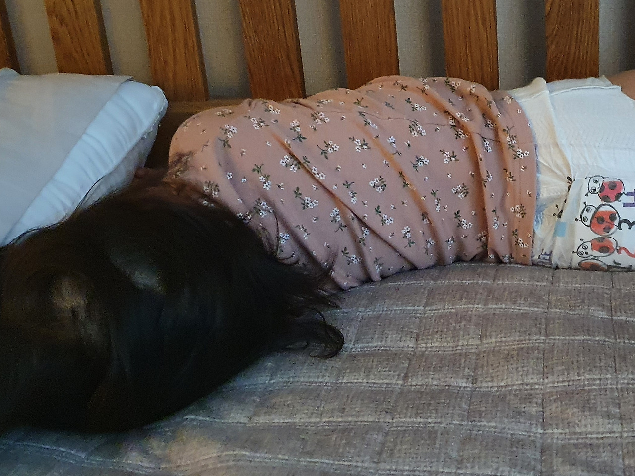 고집쟁이 딸내미 2. 옷 안 입겠다고 있는 힘껏 침대 프레임에 붙어 있는 중.