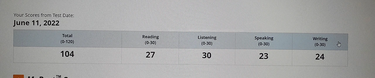 리딩 시간 배분을 잘 못해서 망했다 싶었는데, 막상 시험 직후에 나온 리딩과 리스닝 가채점 결과는 27/ 30! 얼떨떨했다. 그렇게 받고도 계속 불안했는데, 최종 결과가 100을 넘어 안도했다.