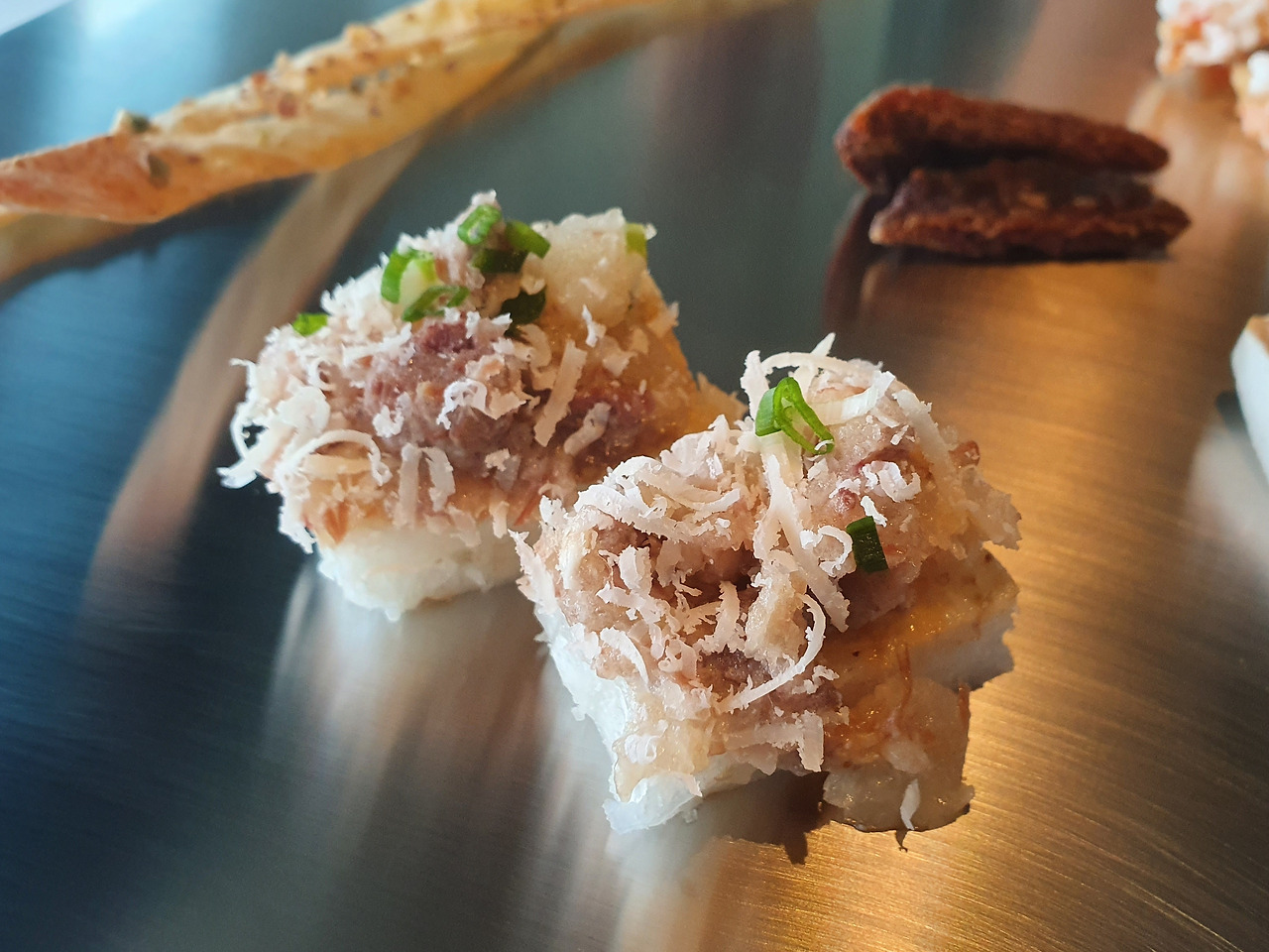 (1) 증편 위에 족편, 치즈, 파를 올린 메뉴는 딱히 기대를 안 했는데 맛있었다. 족편의 비린맛도 없었고, 잘 다져 올리다 보니 식감도 부담스럽지 않게 떡의 쫄깃함과 잘 어우러졌다. 치즈도 감칠맛을 살릴 정도만 딱 적절하게 꼬릿 했고 파의 향도 맵지 않게 강해서 좋았다.