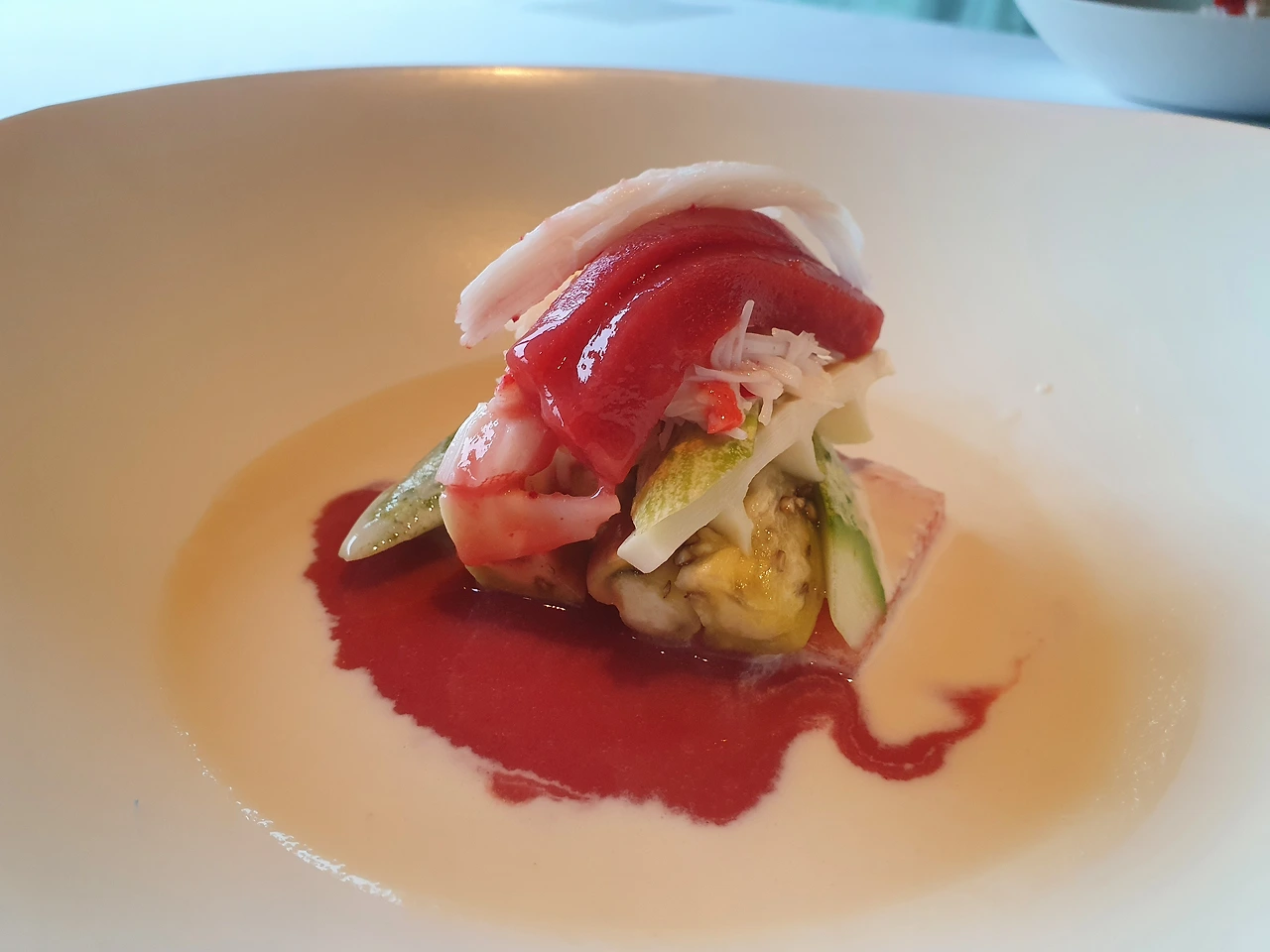 . 부드럽고 상큼했다. 오이, 생 가지 껍질 깎은 것, 죽순, 앵두 과편을 쌓고 잣소스와 앵두 소스를 곁들였다. 여름 여름 느낌.