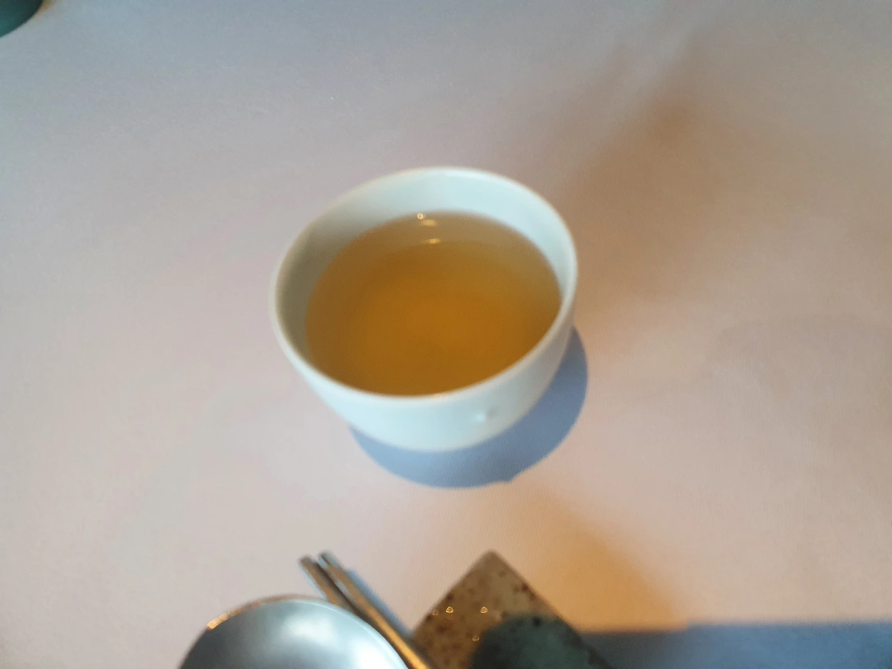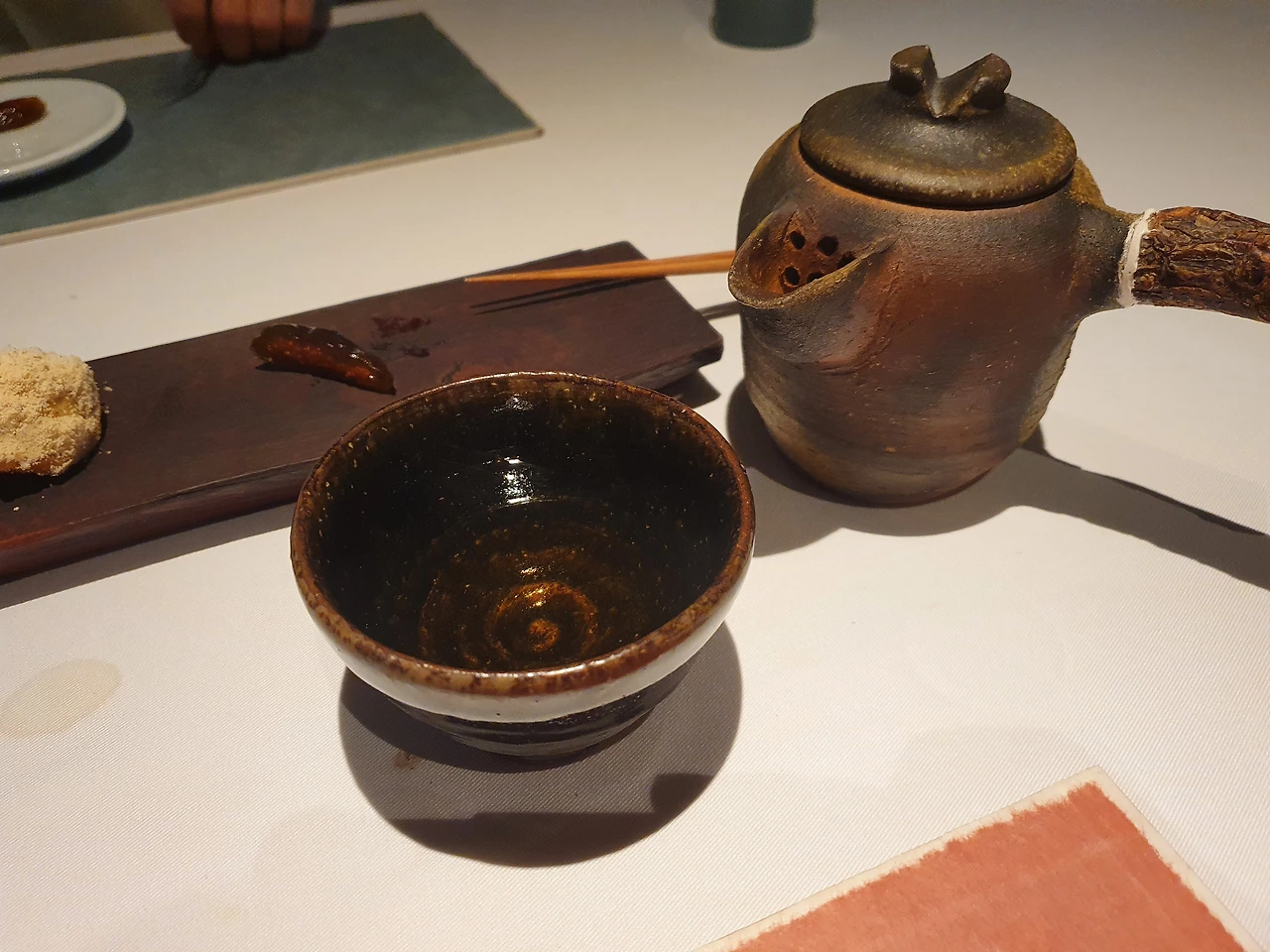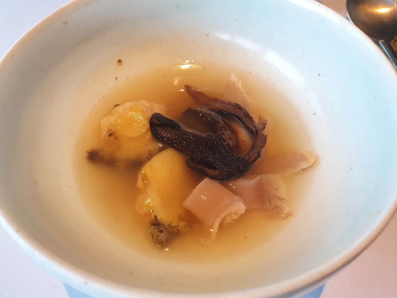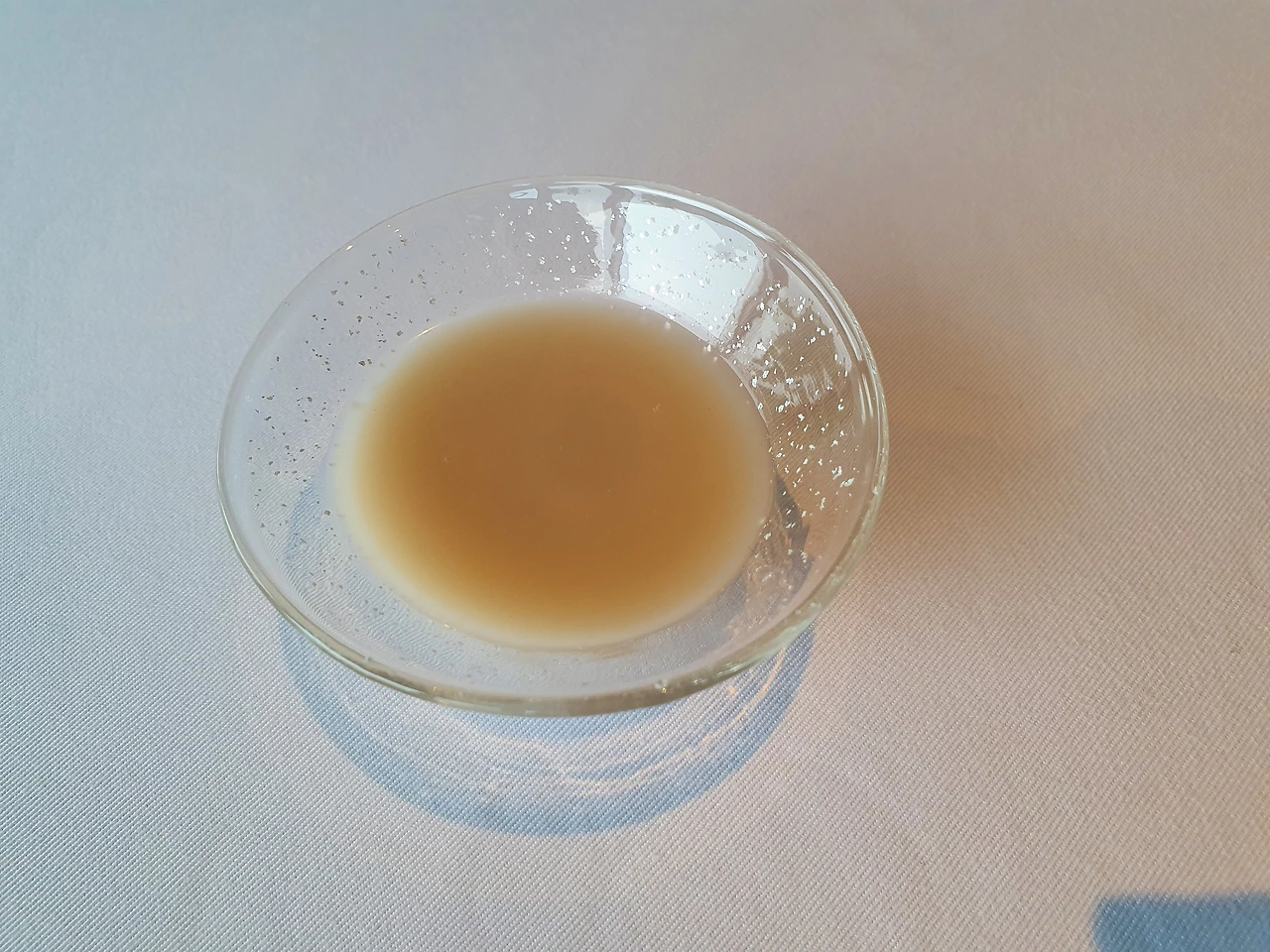 . 전복 만두탕과 곁들이라고 나온 능이주. 다음에 나온 전복 만두탕이 굉장히 무겁고 진해서 이 페어링이 심정적으로 이해는 갔는데, 술 자체가 내 취향이 아니었다. 능이향은 삼계탕에 쓰일 때 말고는 그다지 선호하지 않는 데다, 단독으로 마시기엔 산미가 강했다.