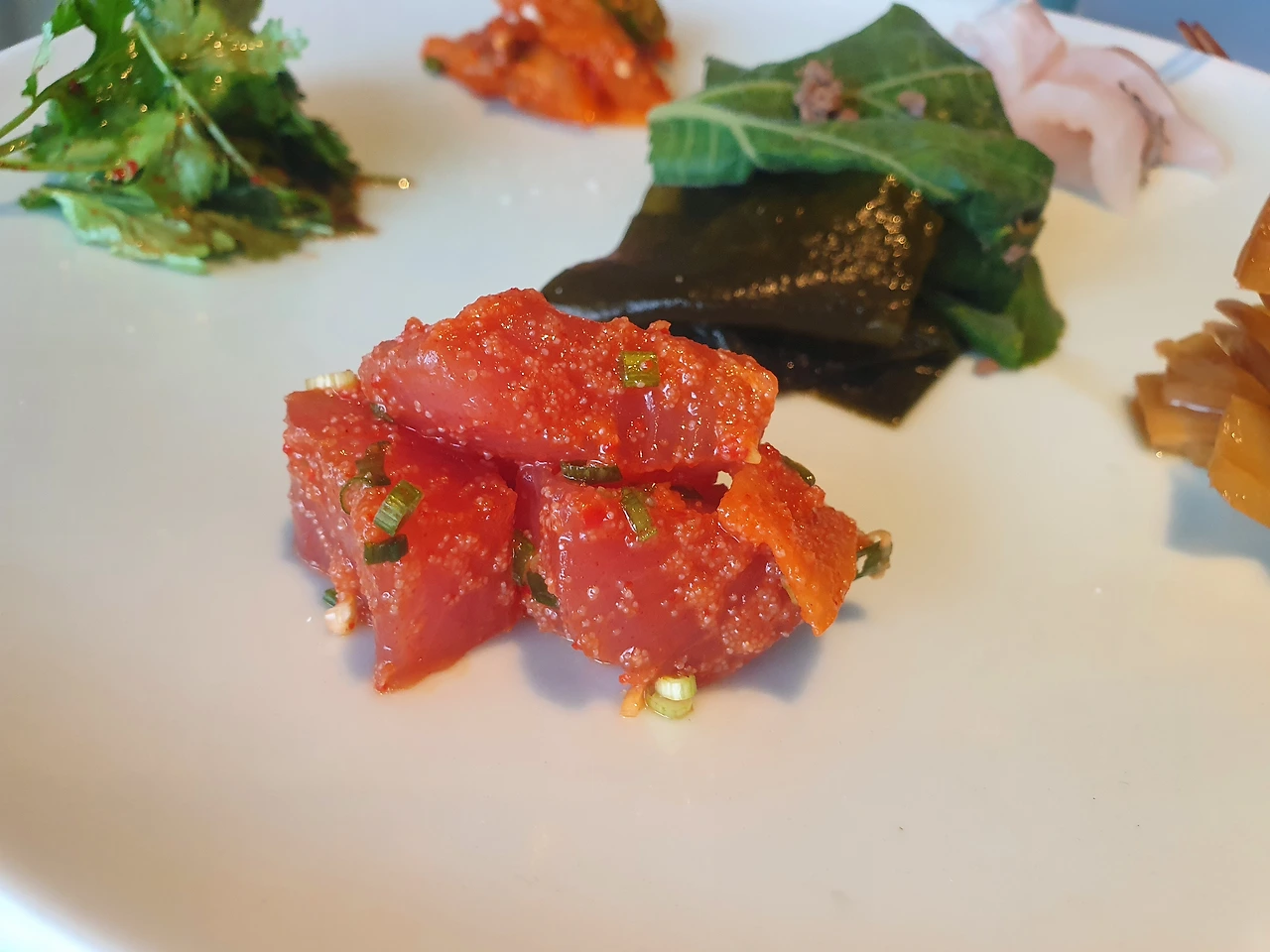 . 두툼한 농어회, 갈치속젓에 무친 병어회, 대구 알젓에 무친 참치회가 메인으로 나왔고 곁들여 먹을 다시마와 고수 무침, 묵은지, 호박잎이 나왔다.